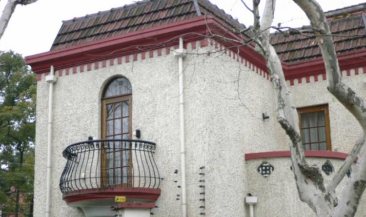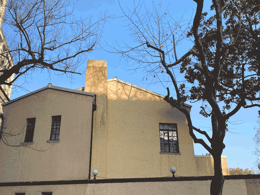 比如武康路210号这座小楼,平面近似三角形,红瓦坡顶,黄色水泥拉毛外墙面。