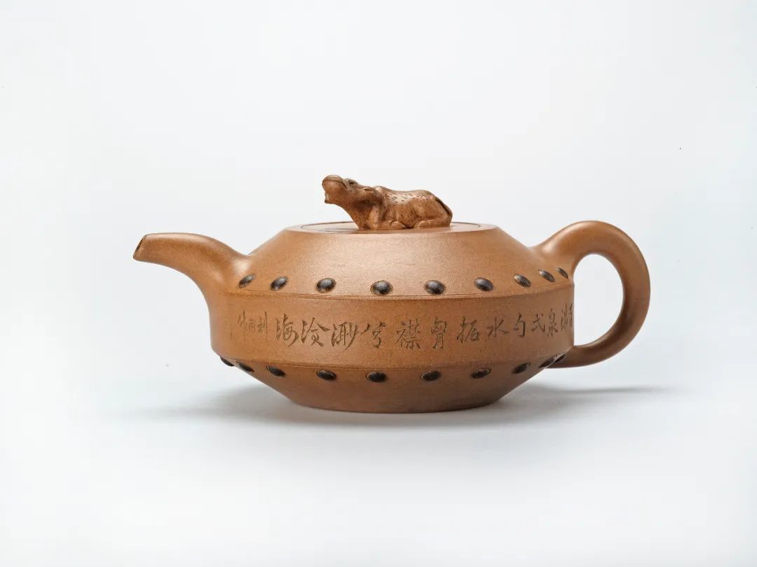 犀登壶为晚清民国流行壶式。过去,牛是农家宝,也是陶工的宝,农民耕田要用牛,陶工用棍砣粉碎陶土也要用牛。