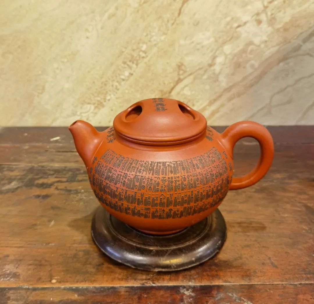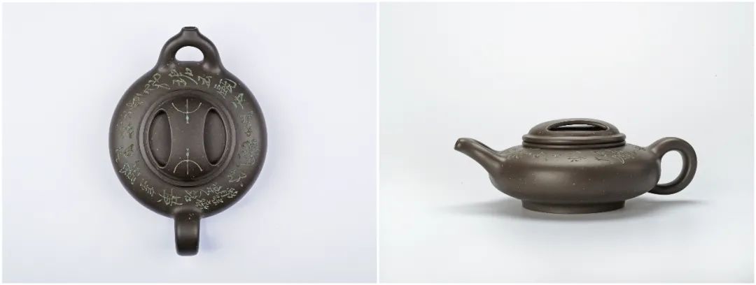 壶盖采用牛鼻孔式的镂空结构,生动性与趣味性完美结合,壶口与壶盖上下密合无缝。整体造型自然庄重、工艺严谨、古朴大方。