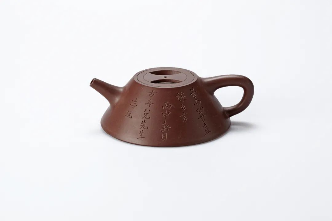 石瓢壶为紫砂茗器中经典款式,为曼生壶式之一。此壶经改良,壶身呈梯形,曲线柔和流畅。壶盖以牛鼻平盖嵌入式,造型浑厚朴拙,简洁见力度。充分体现出秀巧精工的特点。壶身刻铭“苦而回甘,直谅之言。丙申春日,古亭八兄先生清玩。”实为晚清文人壶式。