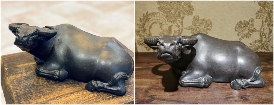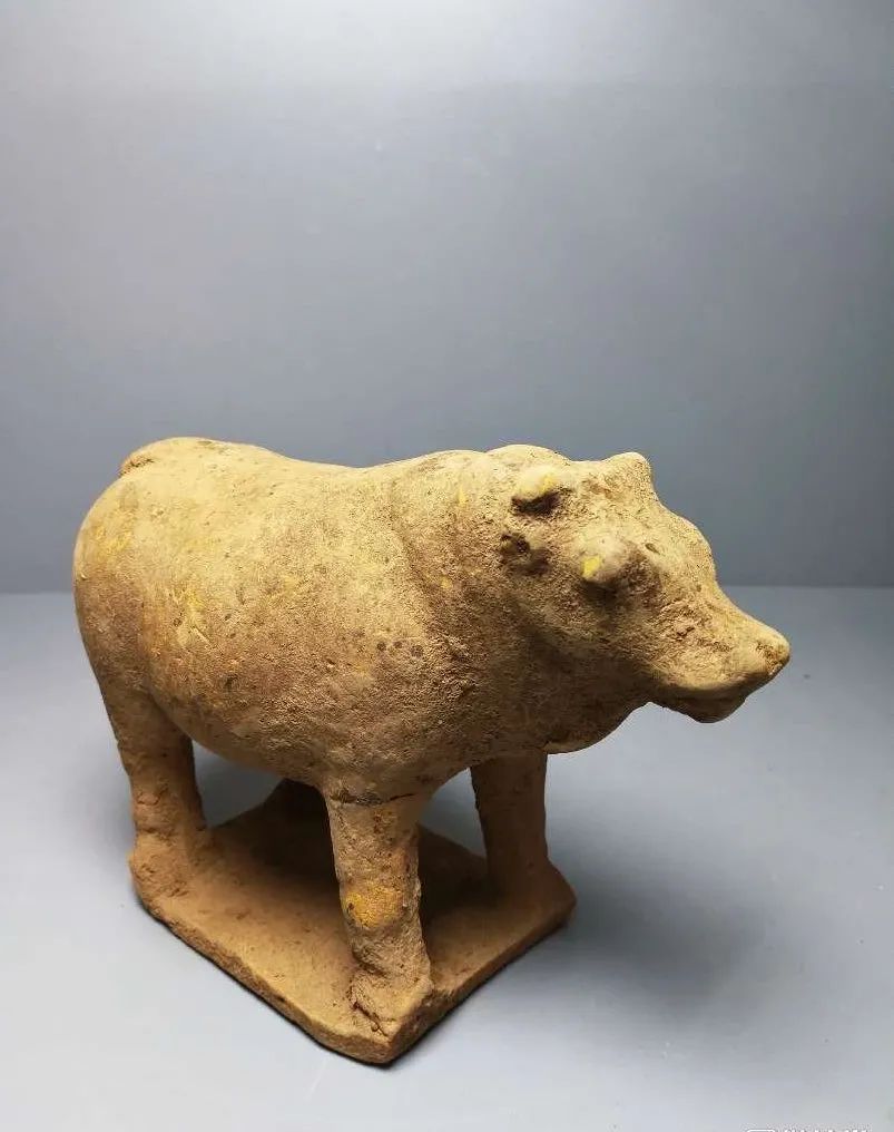 此陶牛应是盛唐时期制作,其型体雄健,肌体肥状,四足踏蹬两平形板上,通体富有张力,形神俱佳,体现了先贤匠人的高操技艺和艺术造旨。