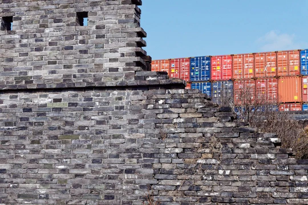 成百上千只码头集装箱,垒起一堵高高的“城墙”,直插云霄。而在集装箱“城墙”掩映下,留下了一段低矮的古城墙,岁月让残垣斑驳陆离,枝叶在砖缝间生根发芽,一道古城门顽强支撑着绵延数百年的优美弧线,似乎比身后的集装箱“城墙”更加伟岸——这就是老宝山城遗址。