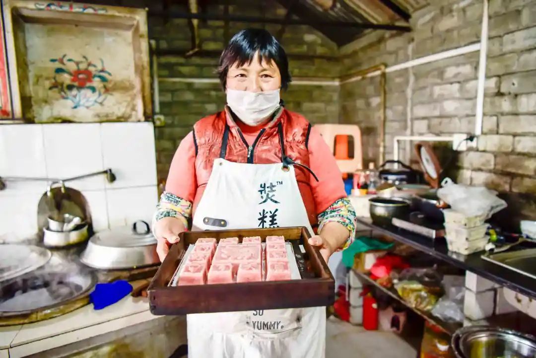 “后来,村里老人有的搬迁走了,有的家里不再用土灶,所以能吃到这一口软糯香甜的焋糕是越来越不容易了。趁我们现在还做得动,就帮着儿子一起创业,看着每天能卖出这么多蒸焋糕,心里很是高兴,说明还是有很多人喜欢这一道传统的味道。”