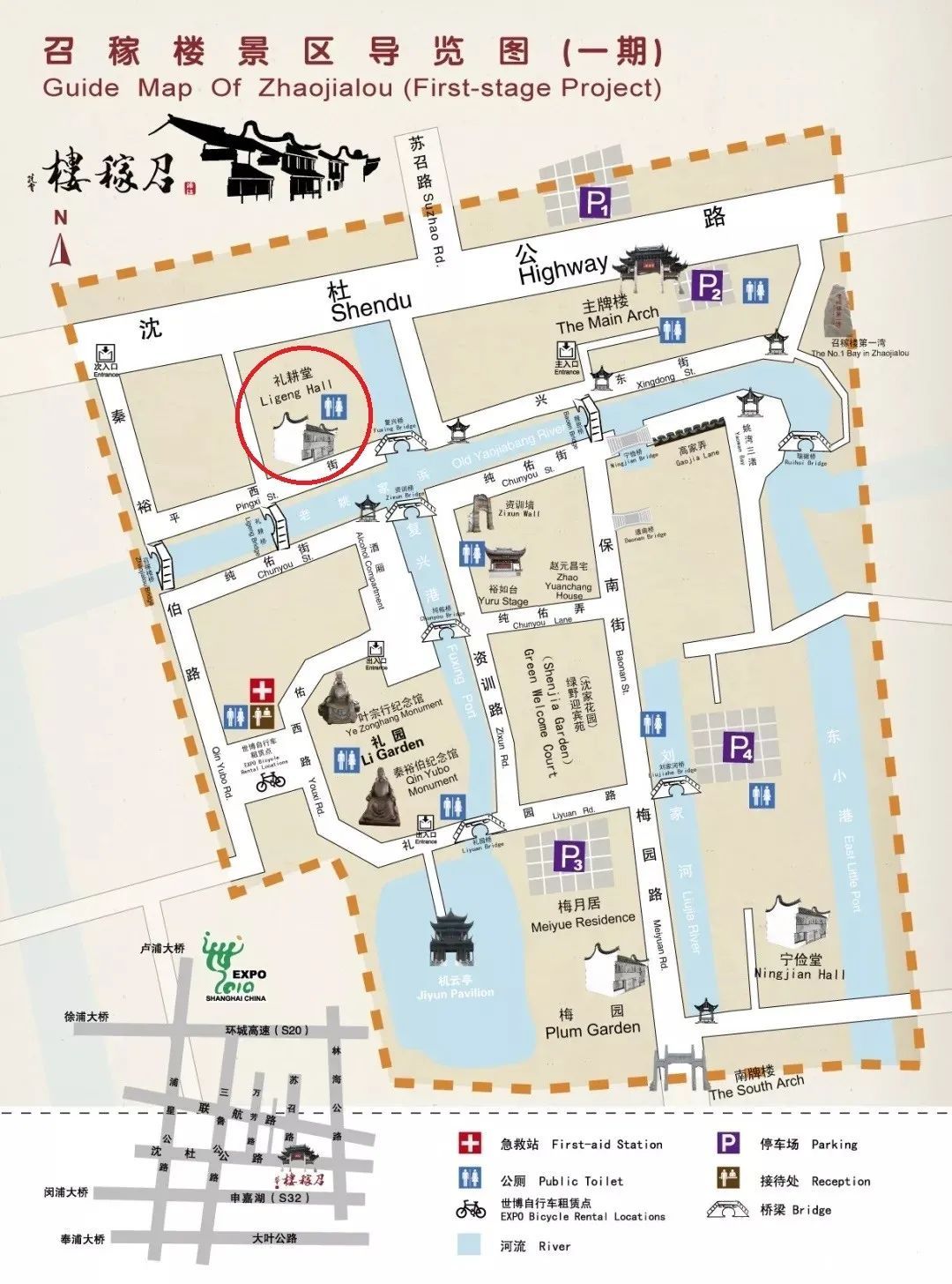 中国的大宅第,照壁一般都与宅第作近距离相隔,以显示其正肃威仪。礼耕堂的群体建筑与砖雕照壁却隔河(市河姚家浜宽约26米)相望,这种格局很少见。这除了增加建筑的气势之外,体现了奚氏家族有远大的志向,长远的思谋,开阔的胸怀,大度的气量。