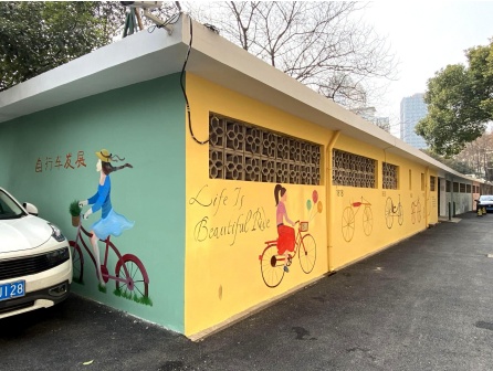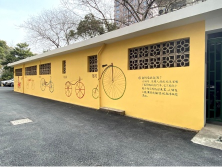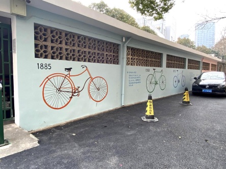 原有非机动车库外墙修缮的基础上,挖掘自行车的历史并绘制于外墙,借此展示非机动车的故事,展示生活的智慧。
