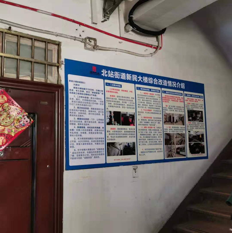 为进一步解释相关政策,消除居民疑惑,社管办在楼道醒目处张贴“新民大楼综合改造情况介绍”公布实施原则、改造内容、效果图、施工信息等内容。随着工程的不断推进,在每个施工节点张贴安民告示。