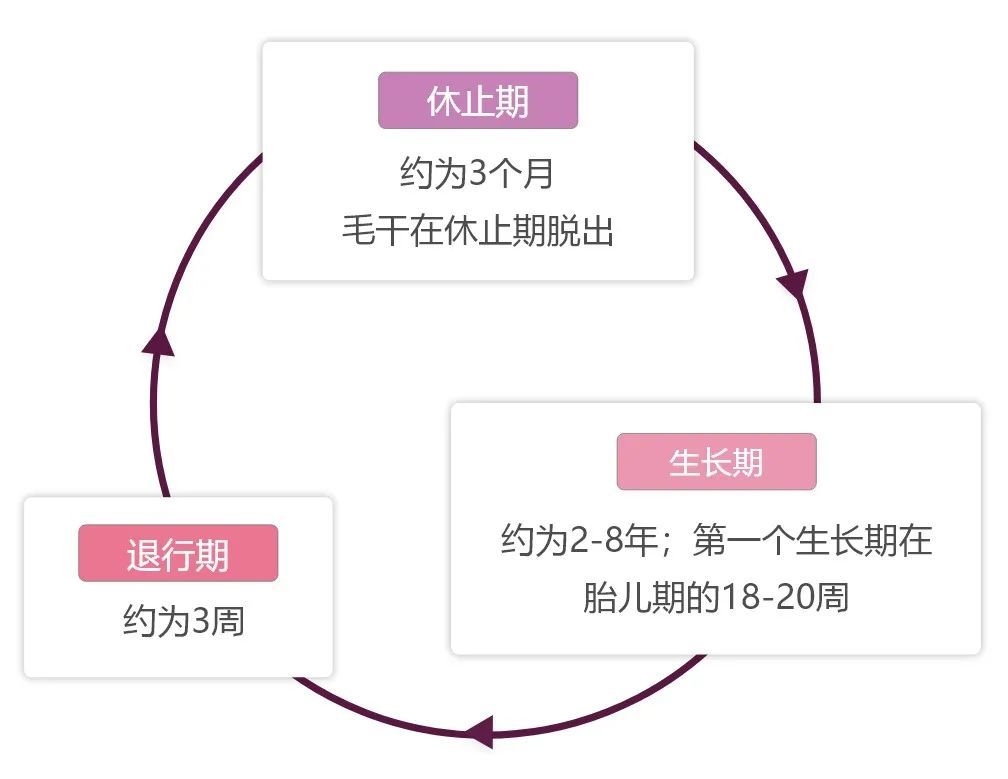毛囊的生长周期包括生长期、退行期和休止期,毛干在休止期的期末脱落。胎儿的毛发生长周期有所不同,胎儿的头发在胎儿期18-20周时进入生长期,随后进入退行期,在婴儿期4-8月时第一次毛干脱落。