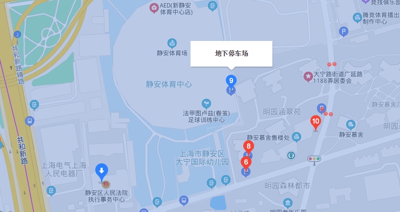 在静安体育中心有地下停车场,步行到上海静安法院需要6分钟。