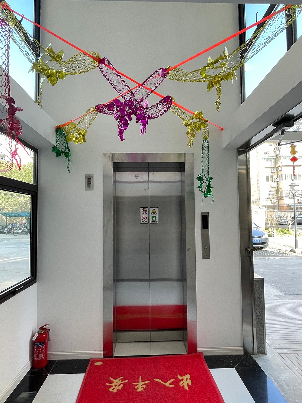 为生活带来方便的电梯更让居民们自发爱护。电梯内外都有红地毯,每一层连廊都布置了绿植、彩带、灯笼等装饰品。