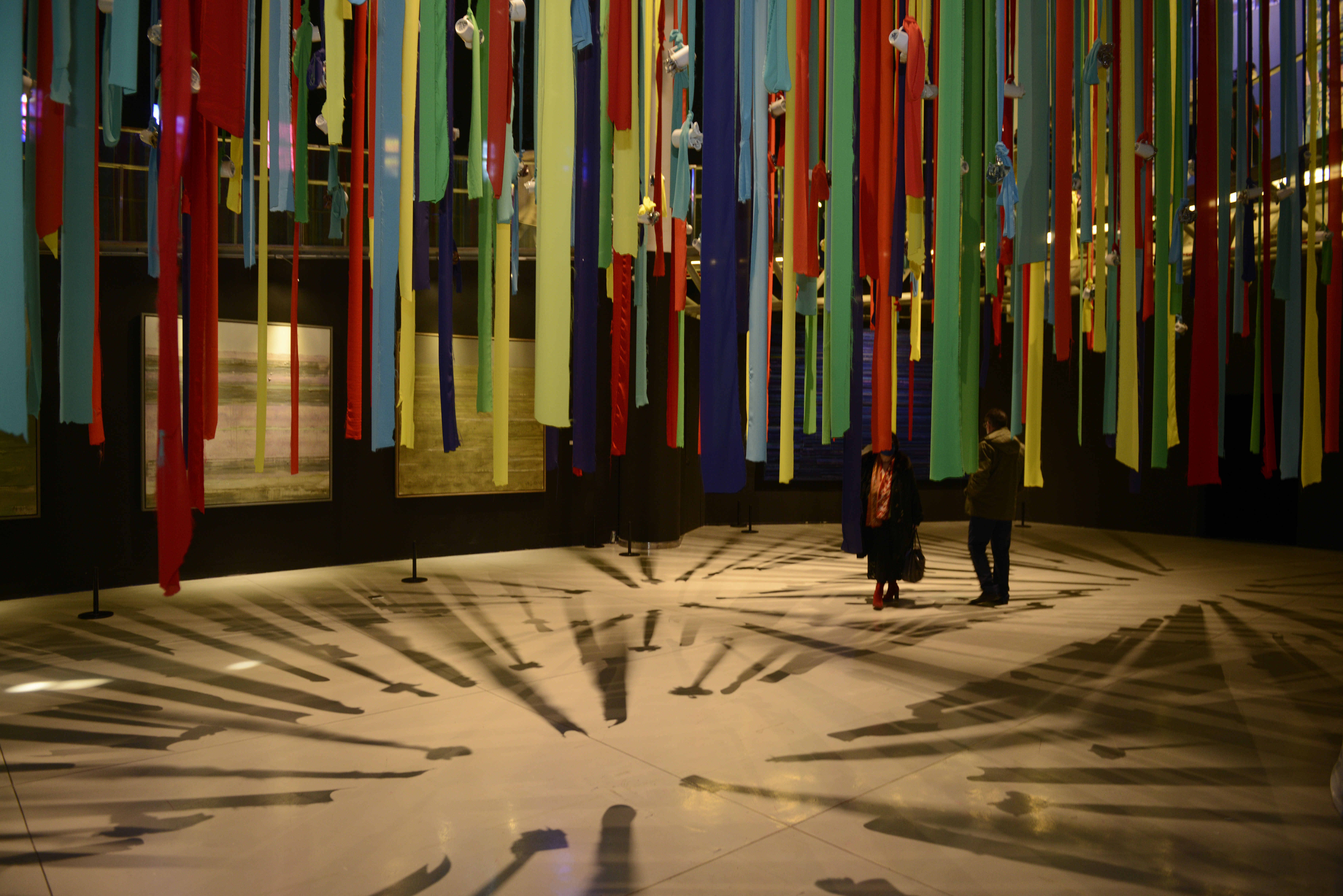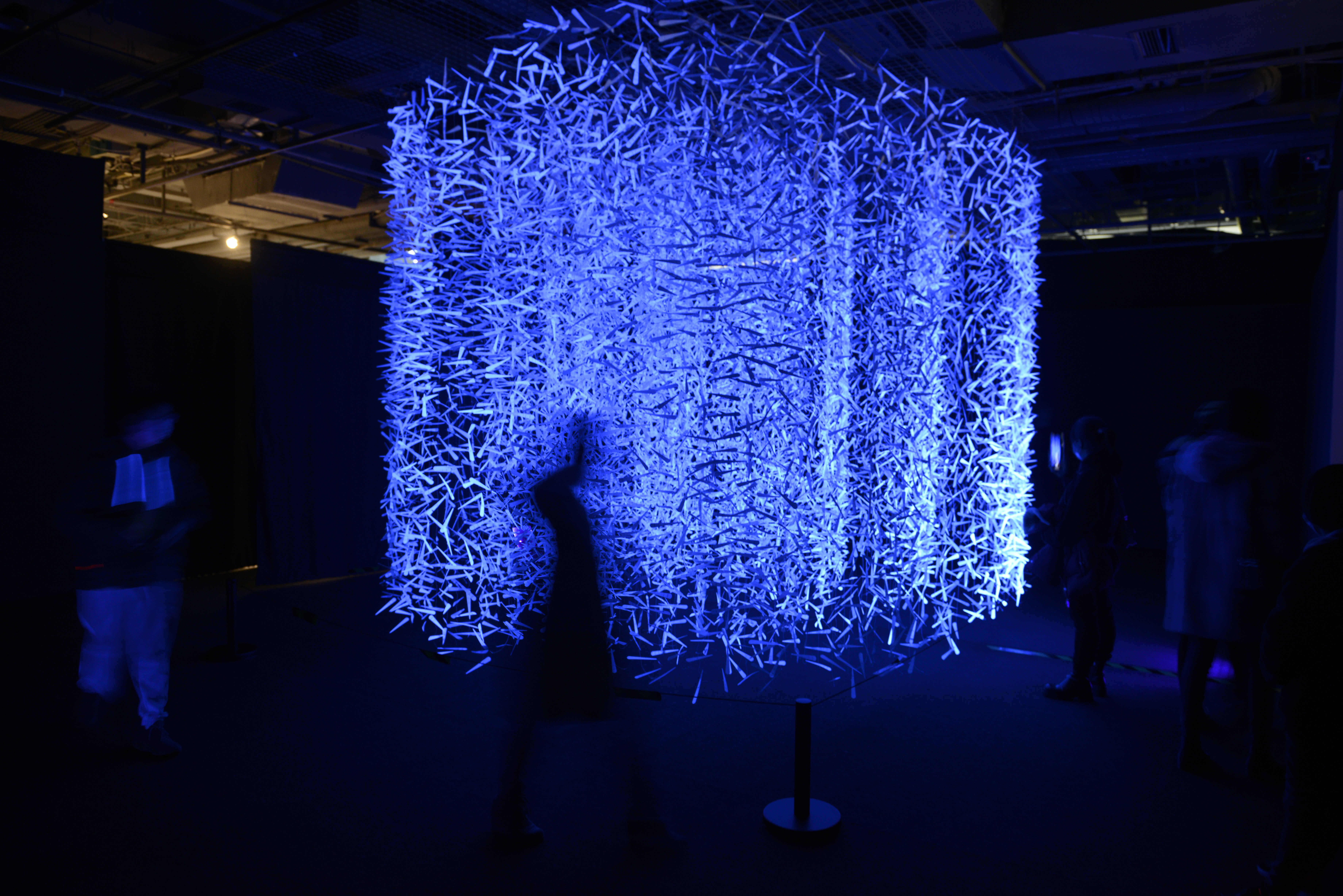 据了解,本次展览是上海当代艺术馆迈向第二个十五年的大展,秉承着“跨界+”的策展理念,邀请八位中外艺术家,作品涵盖绘画、雕塑、生物科技、影像、摄影、巨型装置与墙绘作品等多重话题,例如突破二维的画布,在艺术馆里创造了大峡谷的三维空间的作品《非相》,泛着蓝光的双螺旋纸雕气味花园《湍流礼物》,由三百个捆绑在七彩斑斓如经幡飘扬的瓷杯组成的《慈悲颂》等。
