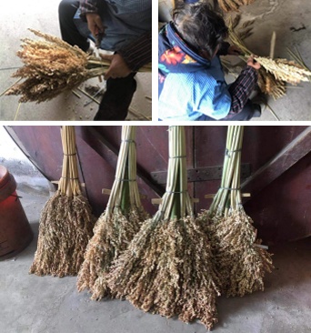 扫把的制作也很简单,将芦粟穗每六支绑成一把,然后再用六支芦粟穗绑在事先准备好的十字竹竿上,最后用剪刀对芦粟穗做适当修剪,一把芦粟穗扫把就制作完成了。