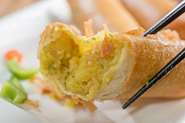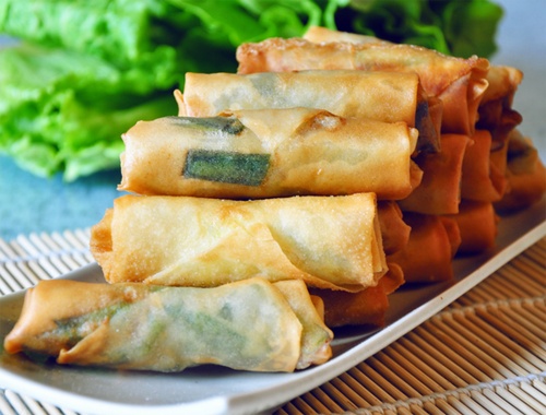 用当季新鲜的菜清洗剁成末,再用薄薄的面皮轻轻一卷,放入油锅……等到灿若金条时捞起,美味的春卷就做成了。