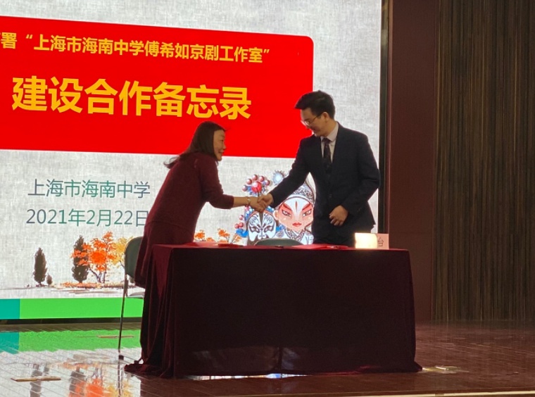 据了解,海南中学是虹口区京剧艺术特色项目学校,为了在“十四五”期间更好地打造学校的京剧艺术教育特色,做好京剧艺术进校园的普及工作,“傅希如京剧工作室”与海南中学正式签约。