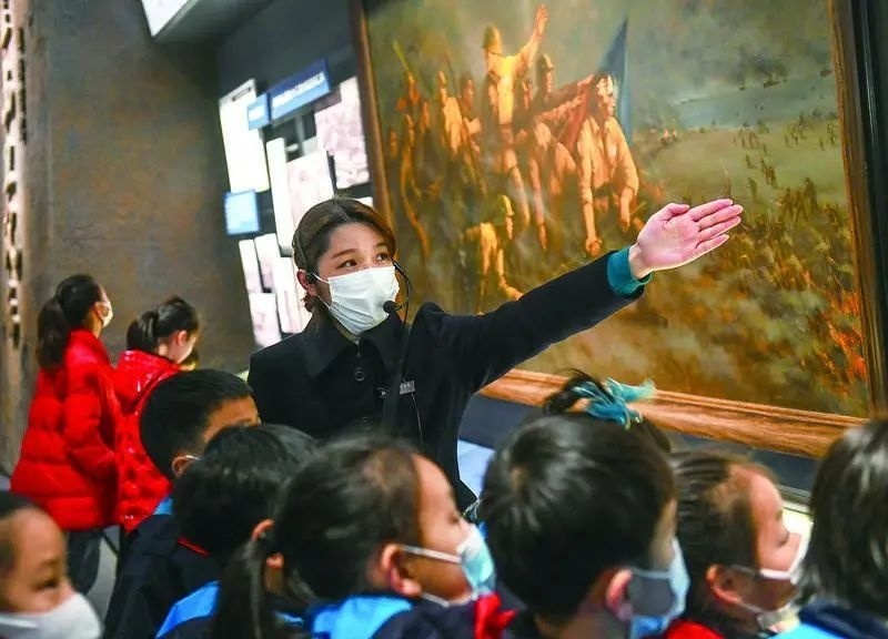 ▲抗战史料馆讲解员沈萍为小朋友们讲解