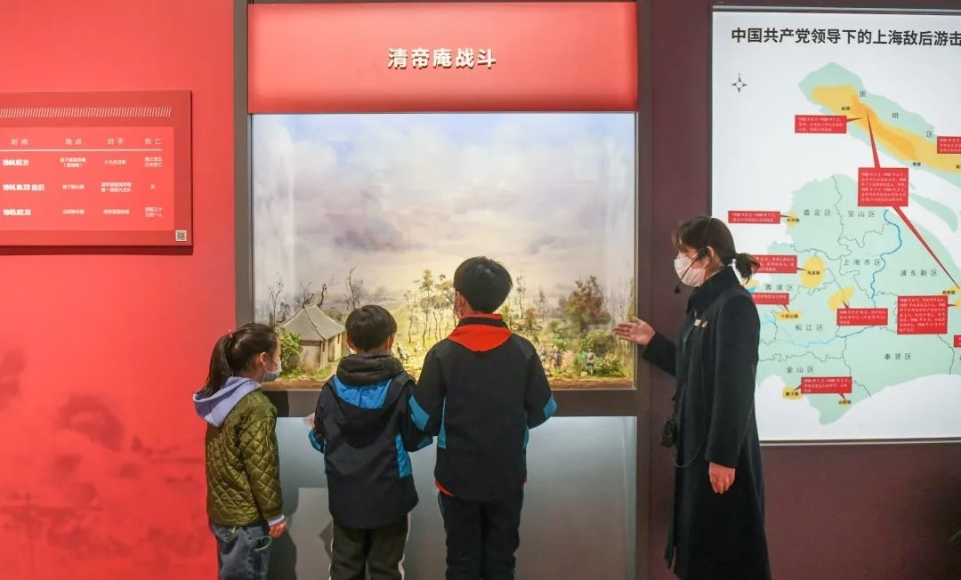 “哪边是日寇,哪边是浦南先遣队?”近日,在上海市金山卫抗战遗址纪念园内的抗战史料馆,讲解员沈萍正站在清帝庵战斗的模型前,向海棠小学的一群小朋友介绍这场激烈的战斗。