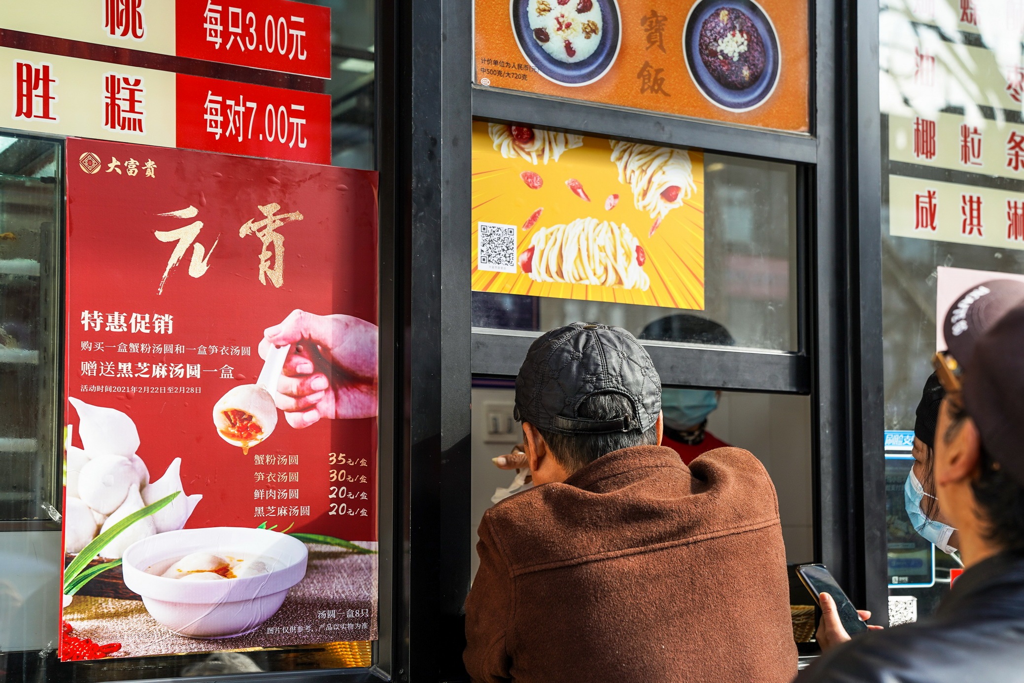 假如想尝试新口味,也可以来甜爱路上的大富贵酒楼看看,元宵节汤圆的促销海报位置显眼,临街的外卖窗口排了不少的顾客,一盒盒地将生汤圆带回家。