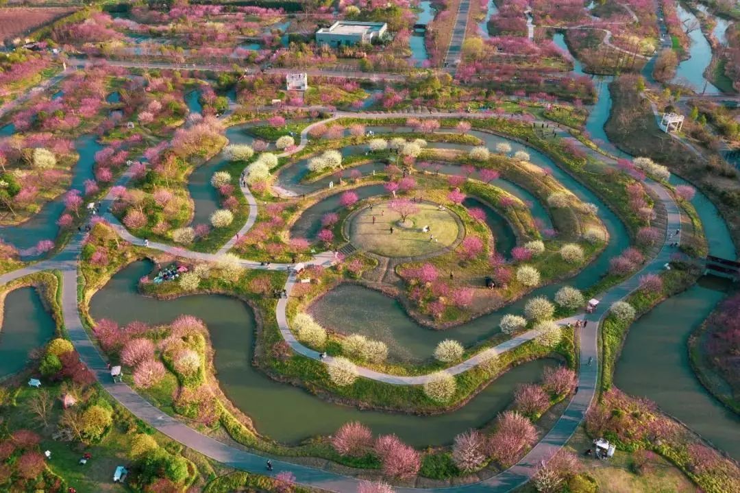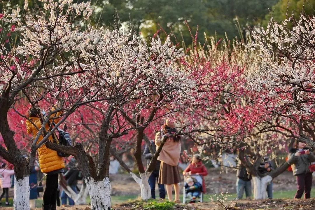 公园内,亭台楼榭错落有致,水天一色美轮美奂。而在这个万物复苏的季节,梅园内的126个品种、四万株梅花也已经进入盛花期。玫红的铁骨红、洁白的江梅、白里透绿的绿萼等争相开放,花海如潮,暗香浮动,构成了一幅美妙的江南春景图。