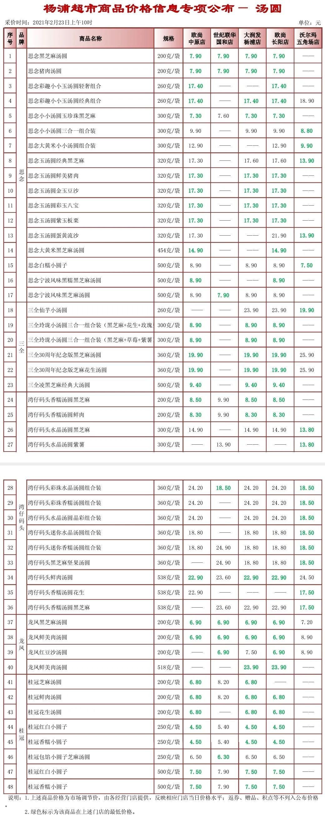 2月25日,区发改委公布了本区5家超市部分汤圆价格,涉及思念、三全、湾仔码头等品牌。其中360克一袋的湾仔码头迷你香糯汤圆组合装、湾仔码头黑芝麻坚果汤圆差价最大,均为6.4元。快来看看你爱吃的汤圆,去哪里买更便宜↓