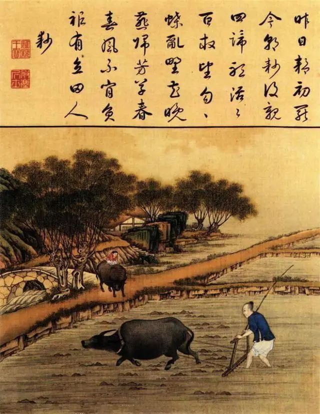 皇帝亲率百官亲耕的故事,最早记载于《礼记·月令》“立春之日,天子亲帅三公…天子亲载耒耜…天子三推,三公五推,卿诸侯九推……”皇帝每一年的春天,都要依照祖制耕种劳作,掌犁向前推行一个来回;而三公则需跟在后面“五推”,以作表率。当然,统治者亲耕是为了宣扬“重农劝农”的积极意义,所以在此之前还有一套“祭先农”的礼仪。