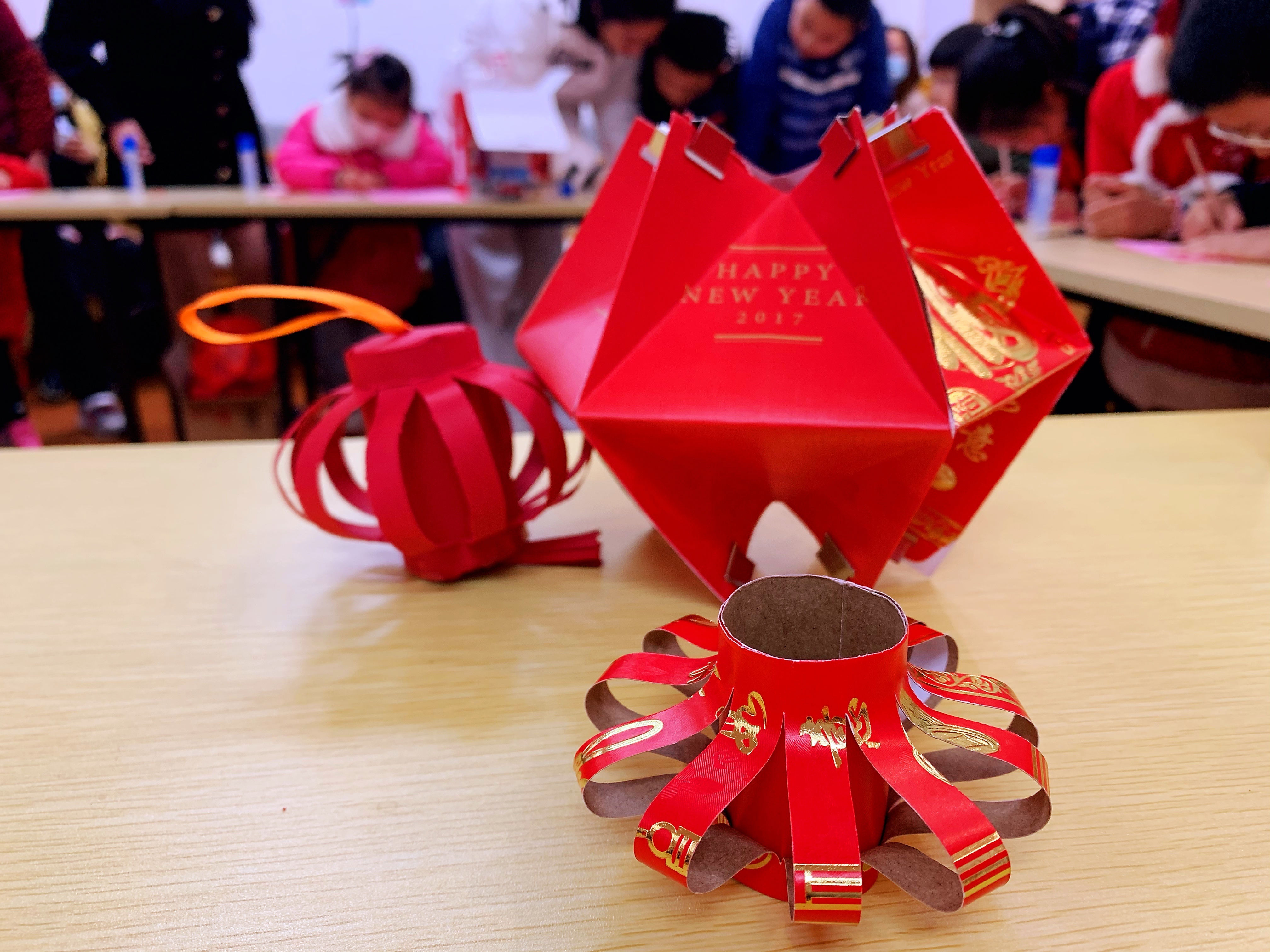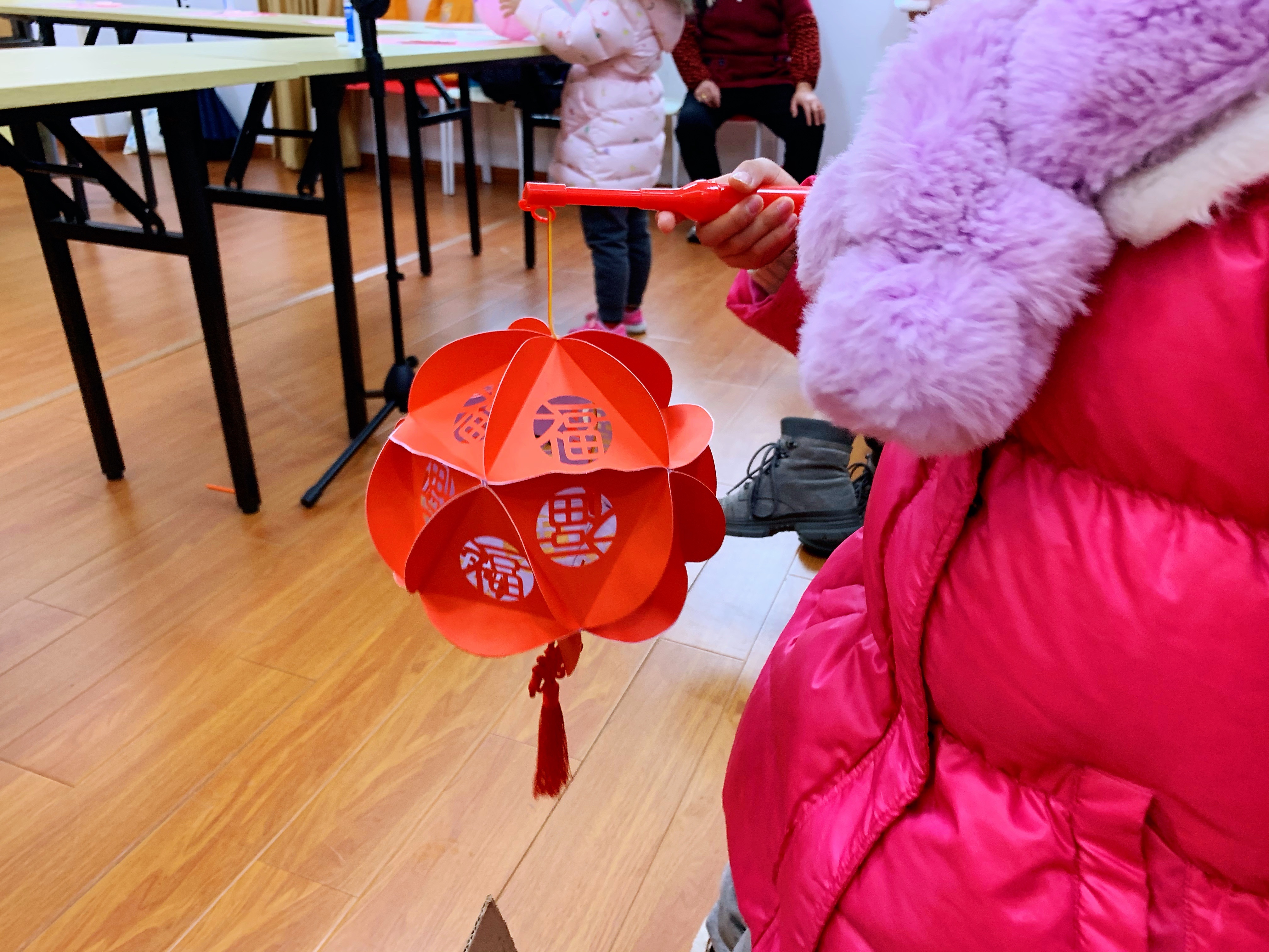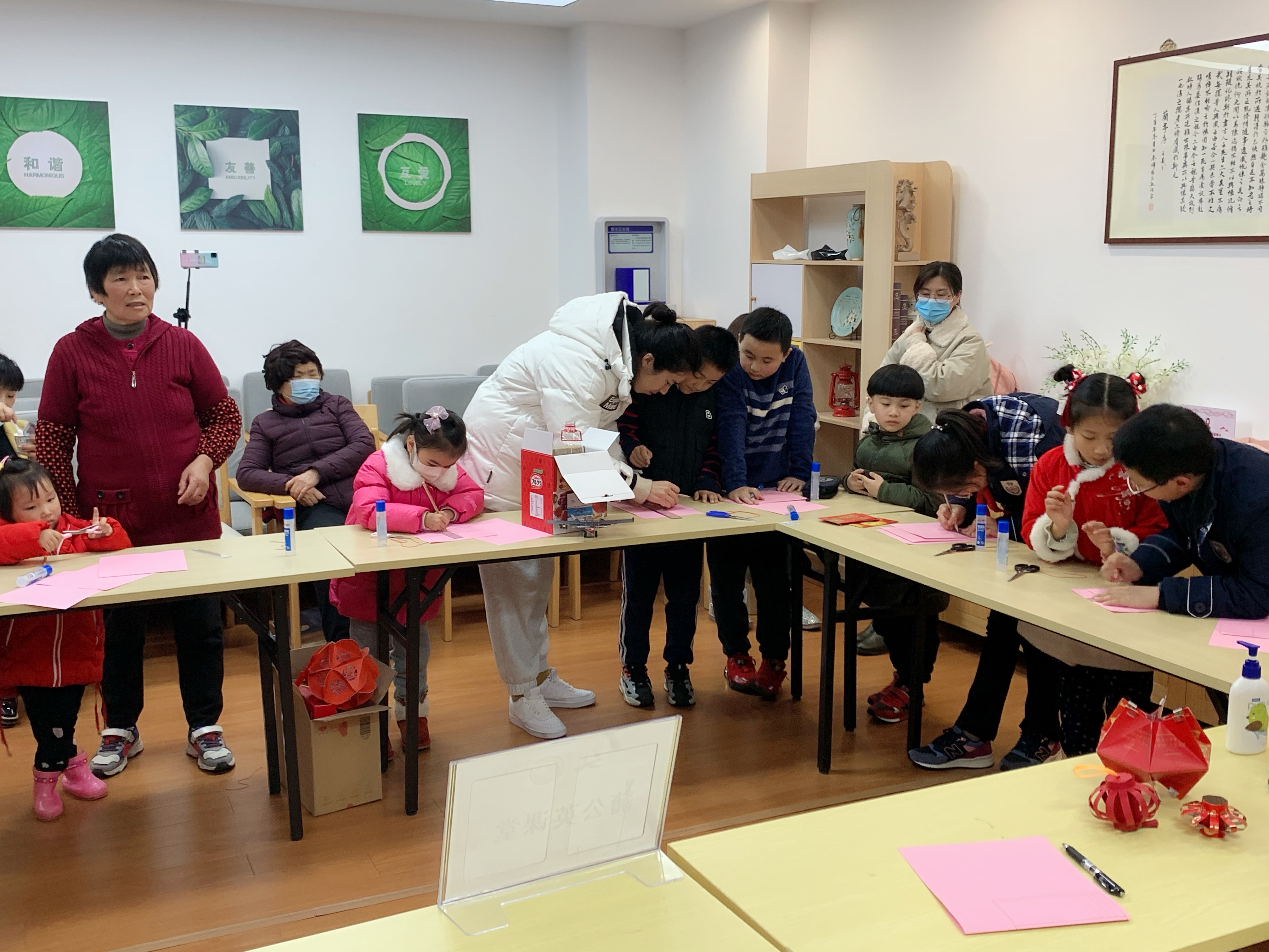 折纸、裁纸、叠纸、组装,穿上红绳,挂上流苏,一个个喜庆的环保灯笼就完成了。“过年期间家里多了不少用过的红包,图案十分精美,丢了很可惜,现在它们也可以‘大显身手’了。”只见精美的“红包灯笼”呈现六角形,红包上的烫金花纹更是成为了灯笼的天然装饰。“我们小时候过元宵节都是提着纸灯笼在街上跑,在塑料灯笼越来越流行的当下,能够和孩子一起变废为宝制作环保纸灯笼也是唤起了我们的童年记忆。”不少家长纷纷加入了制作灯笼的行列,与孩子们一同度过文明绿色的元宵节。