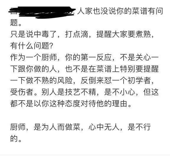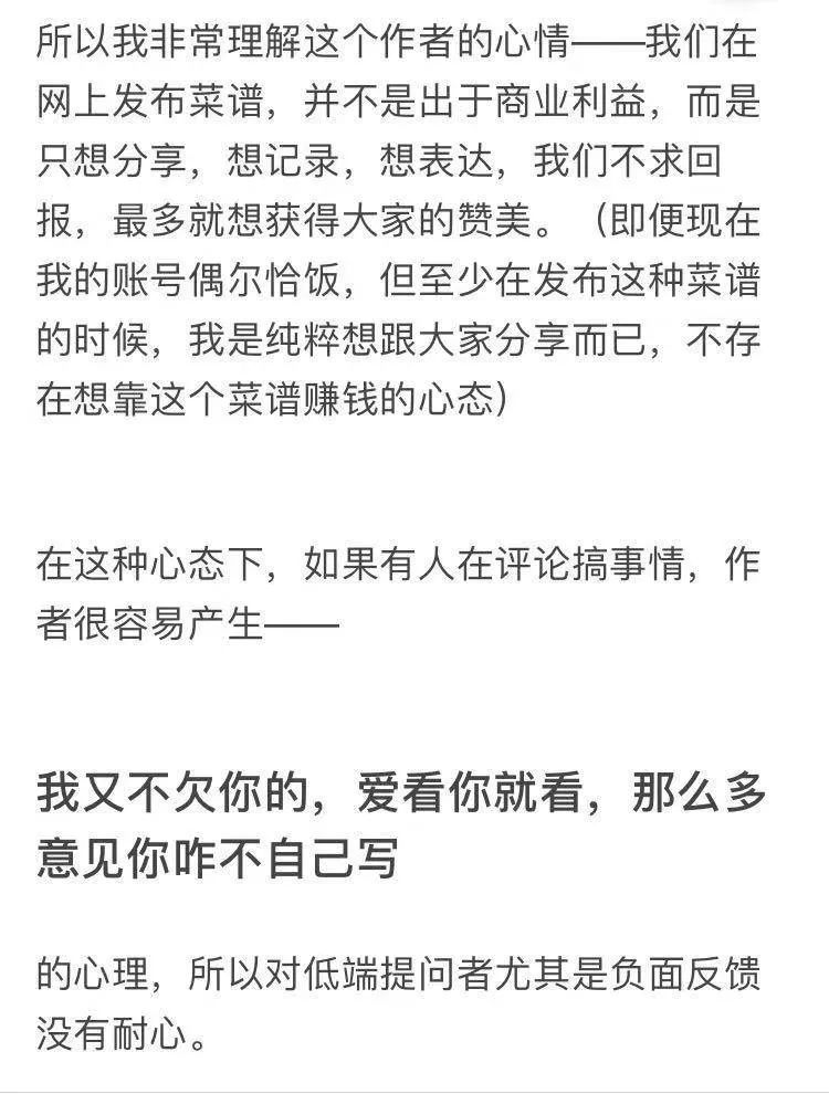 在知乎讨论区,有人认为,作者分享了菜谱就应该想到会有人照着去做,应当对菜谱负有责任,而且作者的戾气也会影响到网友制作美食的体验;反对方则认为,作者只是分享自己的生活,是“为爱发电”,并不是专业人士,且过度追责可能影响分享者的积极性。