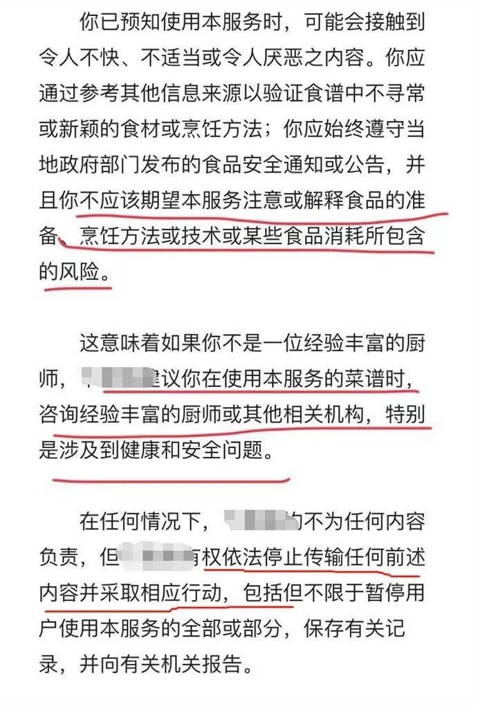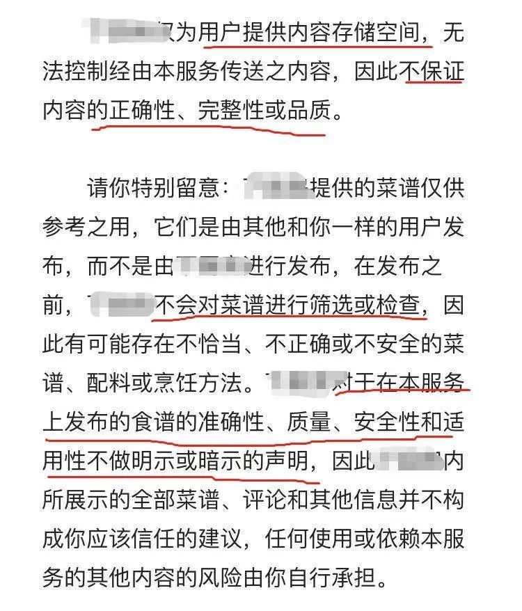 查阅该平台的用户协议,记者发现平台明确将自己定义为用户的“内容存储空间”,“不保证内容的正确性、完整性或品质”。在“特别留意中”,平台提示“不会对菜谱进行筛选或检查”,不对“食谱的准确性、质量、安全性和实用性”做“明示或暗示的生命”,并建议使用时,“咨询经验丰富的厨师或相关机构”。