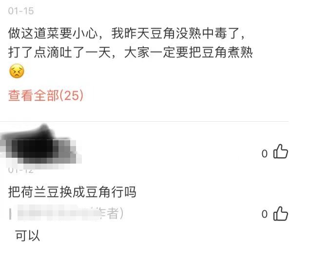 2020年5月,某美食分享平台的用户上传了荷兰豆炒培根的菜谱。今年1月,有人问作者,“把荷兰豆换成豆角行吗”,作者回答“可以”。随后,另一名网友在菜谱下回复称,“做这道菜要小心,我昨天豆角没熟中毒了,打了点滴吐了一天”。