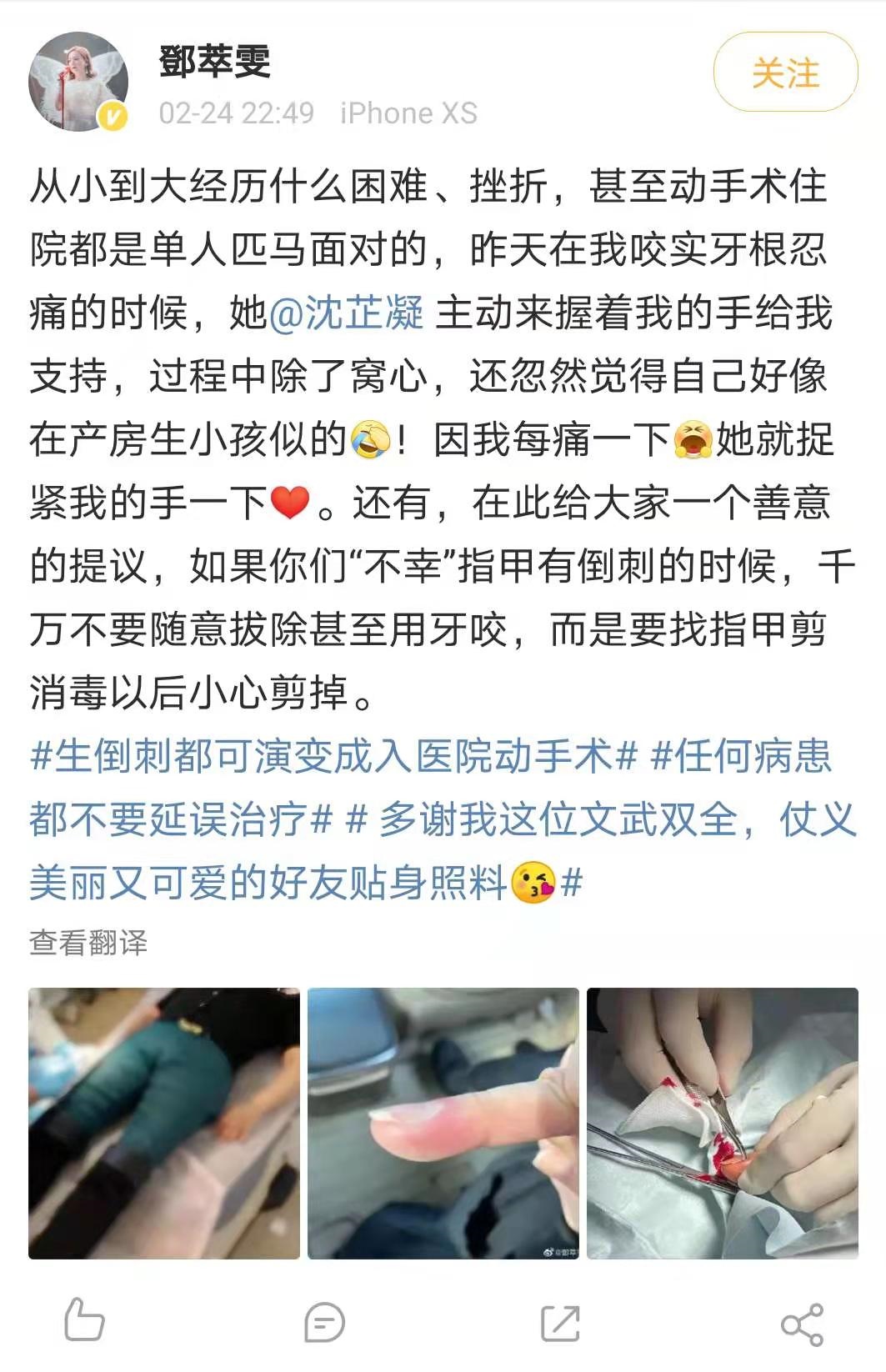 从照片中可以看出,邓萃雯的手指明显红肿,而医生给她拔倒刺时,鲜血淋漓的场面更是有些瘆人。