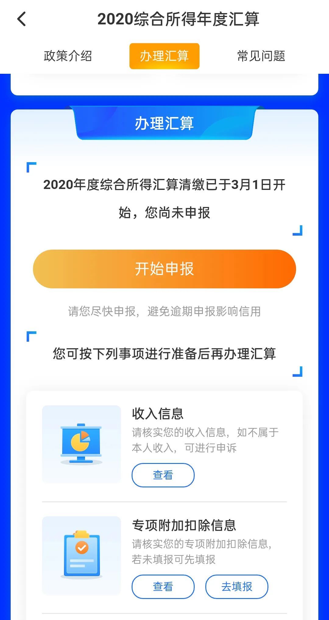 第三步:点击“办理汇算—开始申报”,然后按照流程指示,完成操作即可