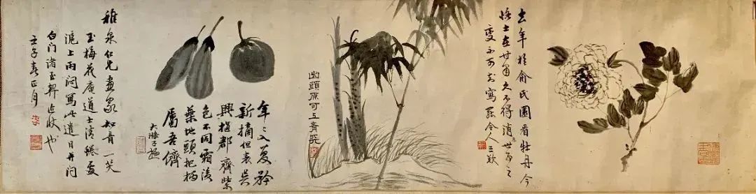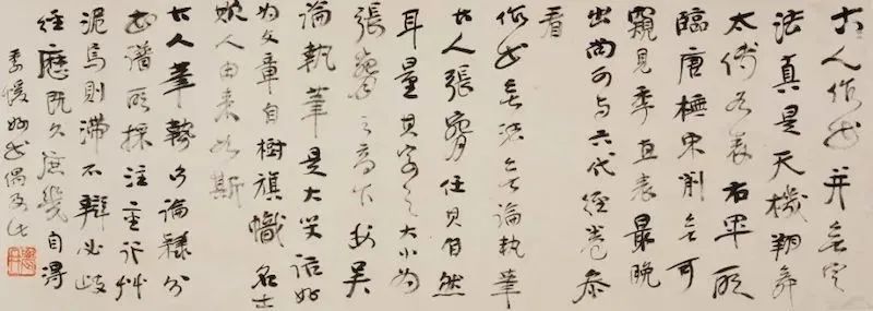 对面的是《赠张季蝯论书横批》,这是曾熙书赠张大千的论书之作,全篇行草相间,任笔而下,真率自然。曾熙提出“作书无法,无论执笔。古人张腕,任其自然耳,其字之大小为张腕之高下”等观点,均为肺腑之言,不乏真知灼见,从中仿佛可以看到张大千当年随曾熙学习书法的种种情景。曾熙曾孙曾迎三告诉记者,“张大千著名的以书法写就的菜单其实也是向曾熙学习的。曾熙就曾以这样的形式来写菜单。包括以宣纸代替信纸写信的方式,也来自于曾熙的习惯。”