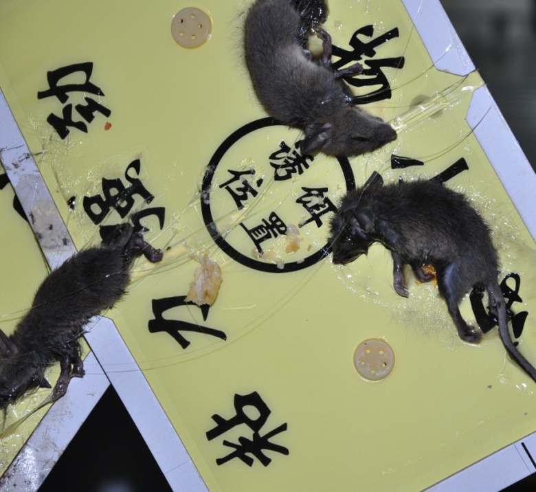 鼠类喜欢沿着墙壁活动,这种行为模式有利于我们将其抓获,在房间沿墙或者发现过鼠的地方放置一定数量的黏鼠板,或者人为制造必经之路(房门口使用门和墙制造唯一通路)并放置黏鼠板和食物诱饵。此法高效快捷,捕获率高,缺点是鼠类的弹跳能力极佳,黏鼠板放置位置不佳或数量过少会导致漏捕,另外放置位置应为鼠的必经之路,存在旁路的情况下不容易捕获。