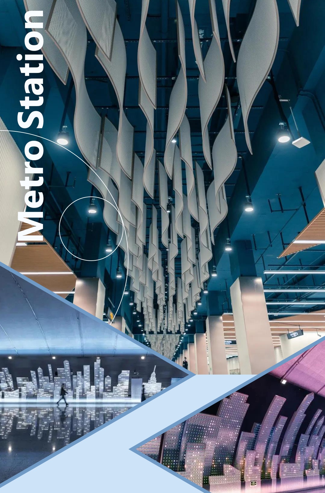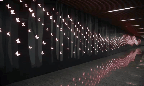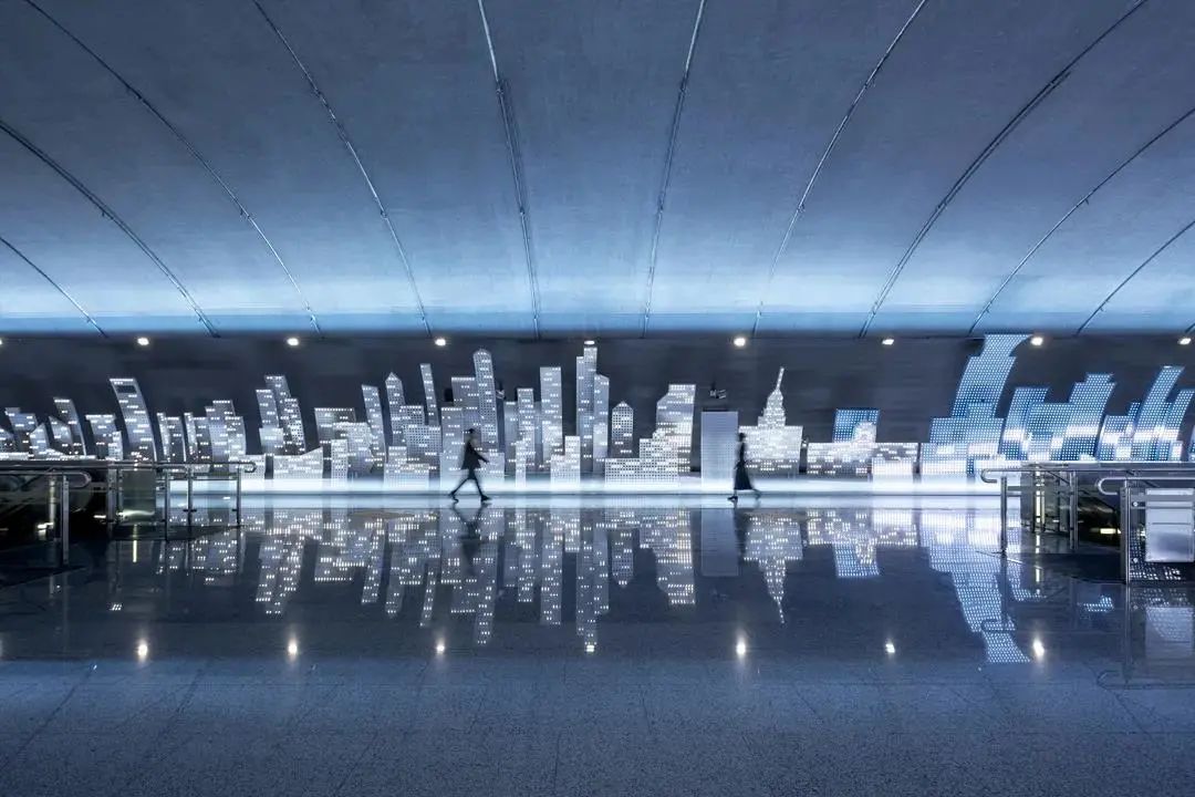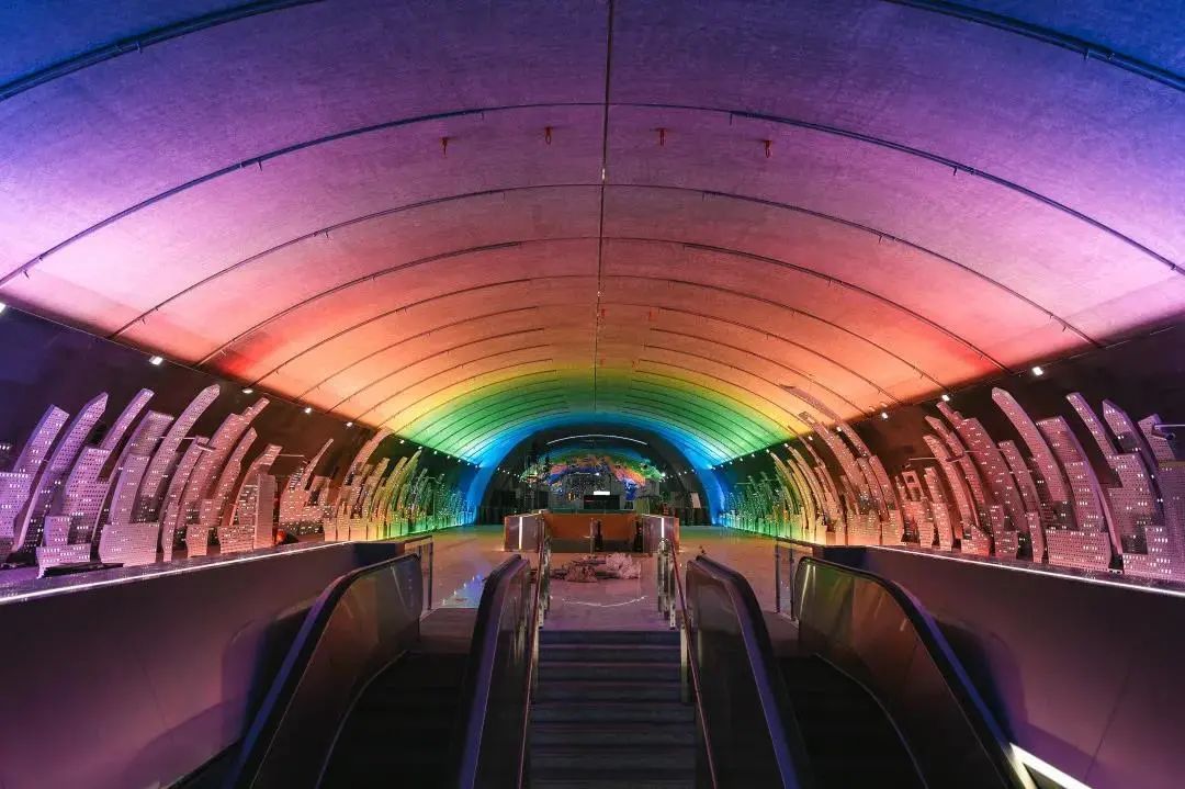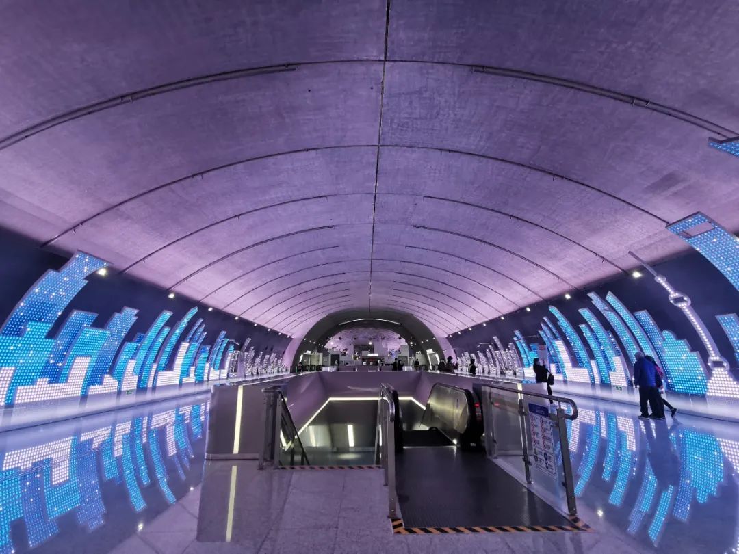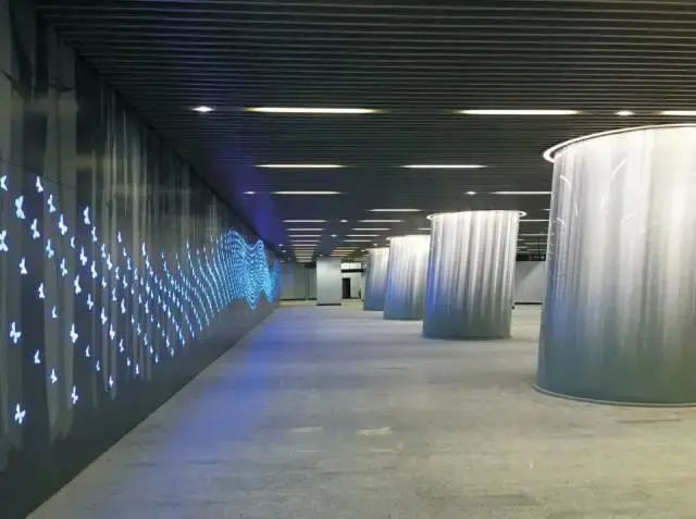 就连地铁走道墙面上也是流动的光线,非常朋克!