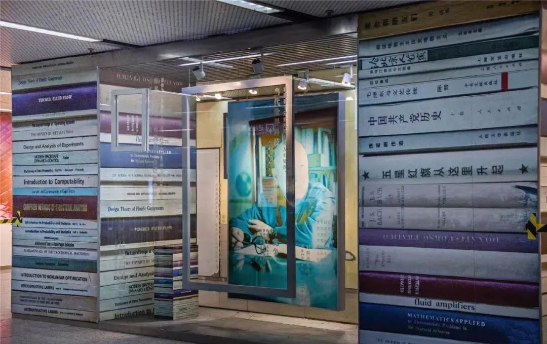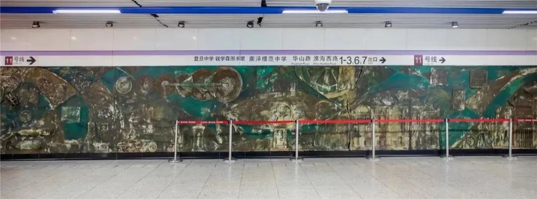 交通大学站地铁站以“钱学森走廊”为主题。站厅以书籍为背景墙,学术氛围瞬间拉满。做旧的浮雕墙以交大为主题,展示了这座名校的百年风姿。