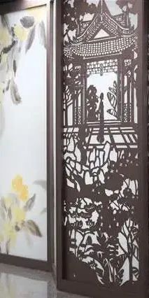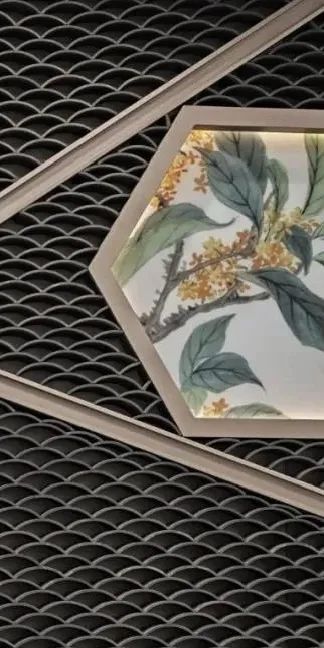 折面上装饰着桂林公园亭台楼阁的剪影,以及各种国画桂花、蝴蝶蜻蜓、词句书法等等,就连地面上,都有桂花的印记。