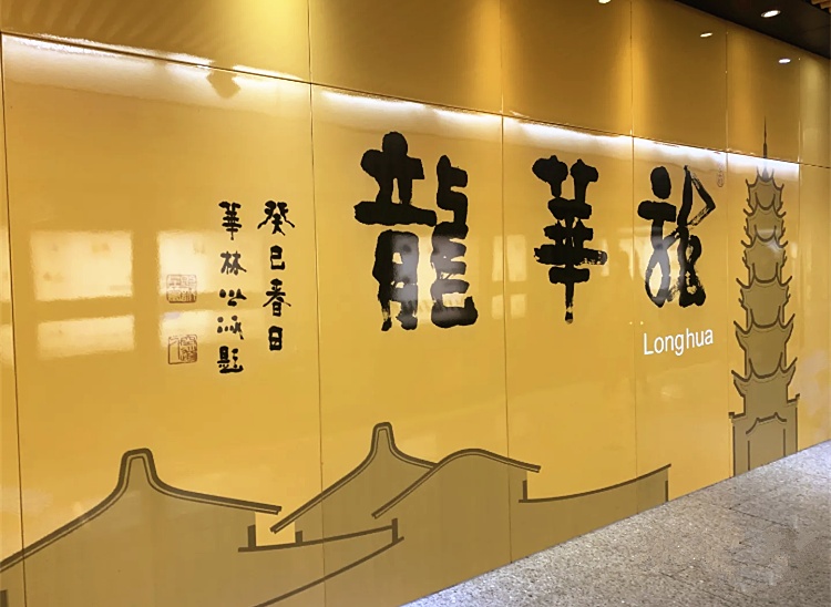 站厅有一幅大量珠串构成了精彩的陶瓷壁画《龙华钟鼓》,晚钟、山门、佛塔、飞天等图案,描绘了热闹的龙华寺景。