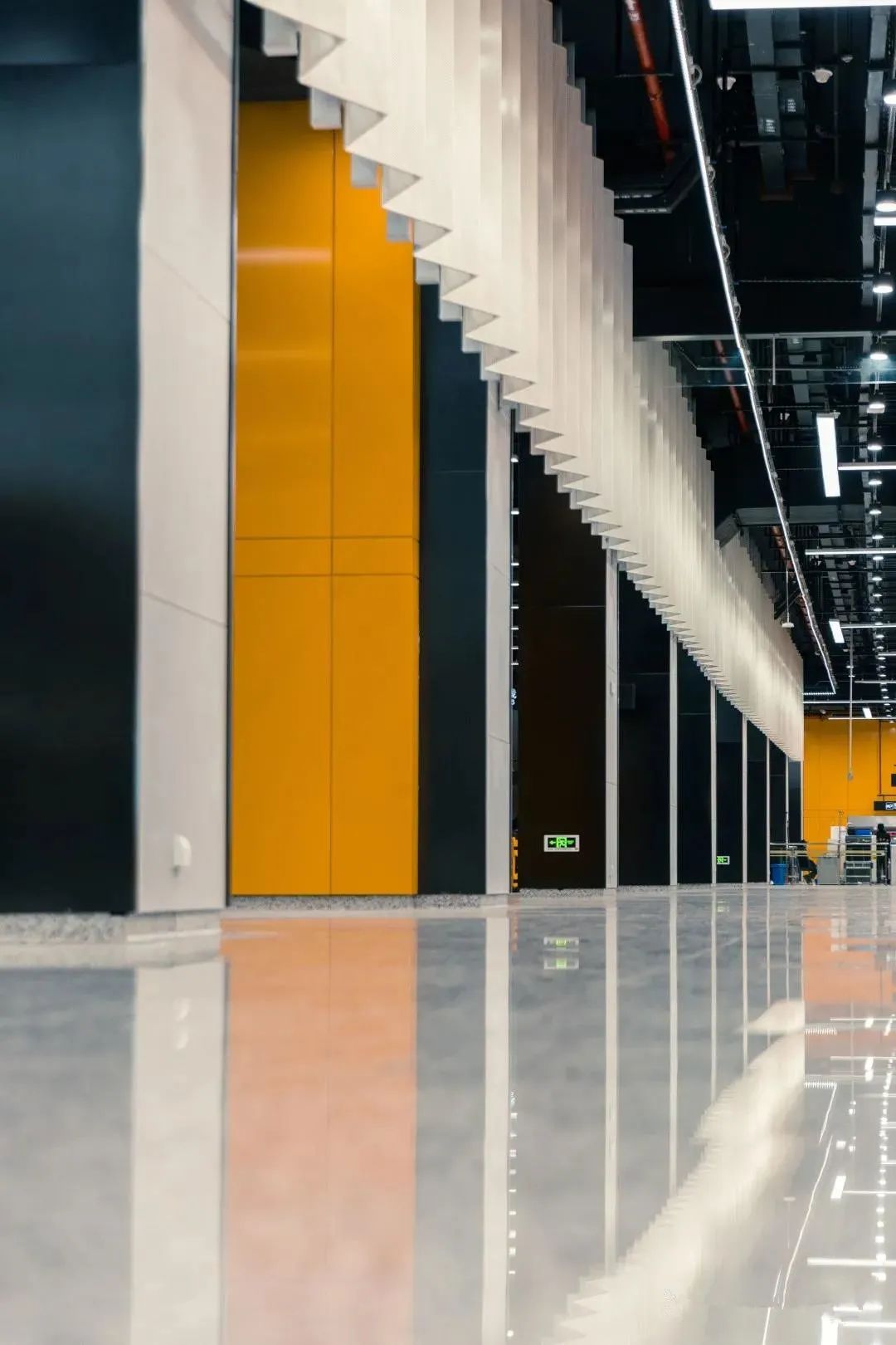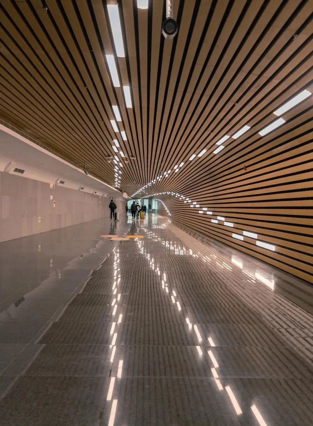 站厅走廊头顶的彩色木板,装饰简单,低饱和度的莫兰迪配色非常北欧。