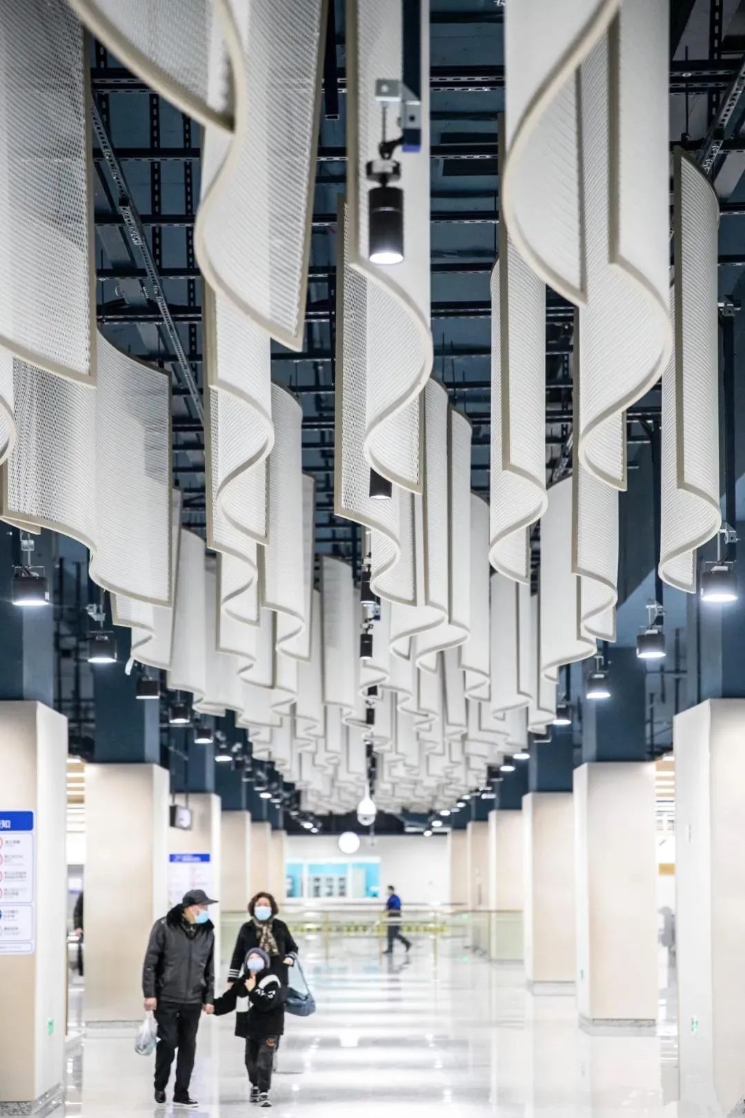 蓝白色调的波浪吊顶像是蜿蜒流动的河水,很有动感,也为长风公园地铁站带来一丝清爽。
