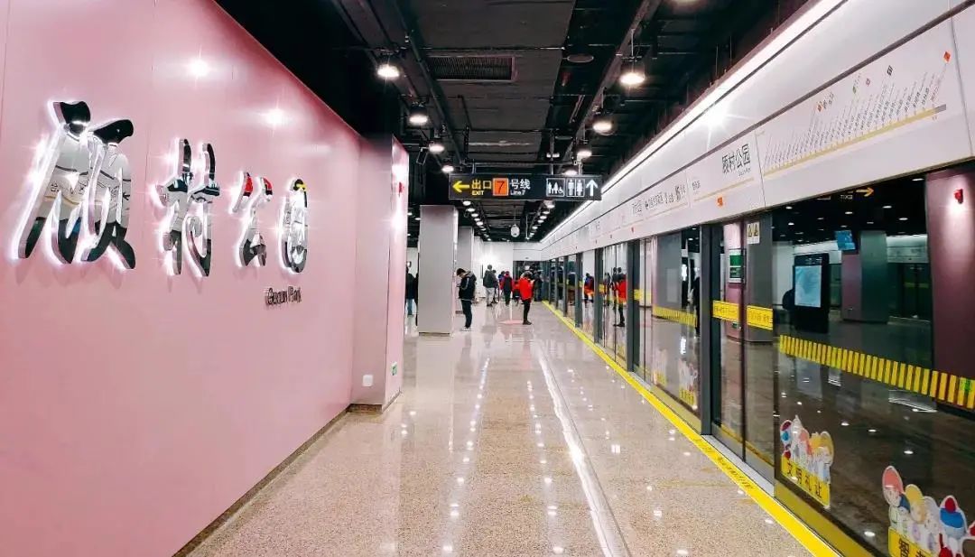 顾村公园因为樱花而出名,所以地铁站充满了大量的樱花元素,全站粉色系,浪漫而美好。
