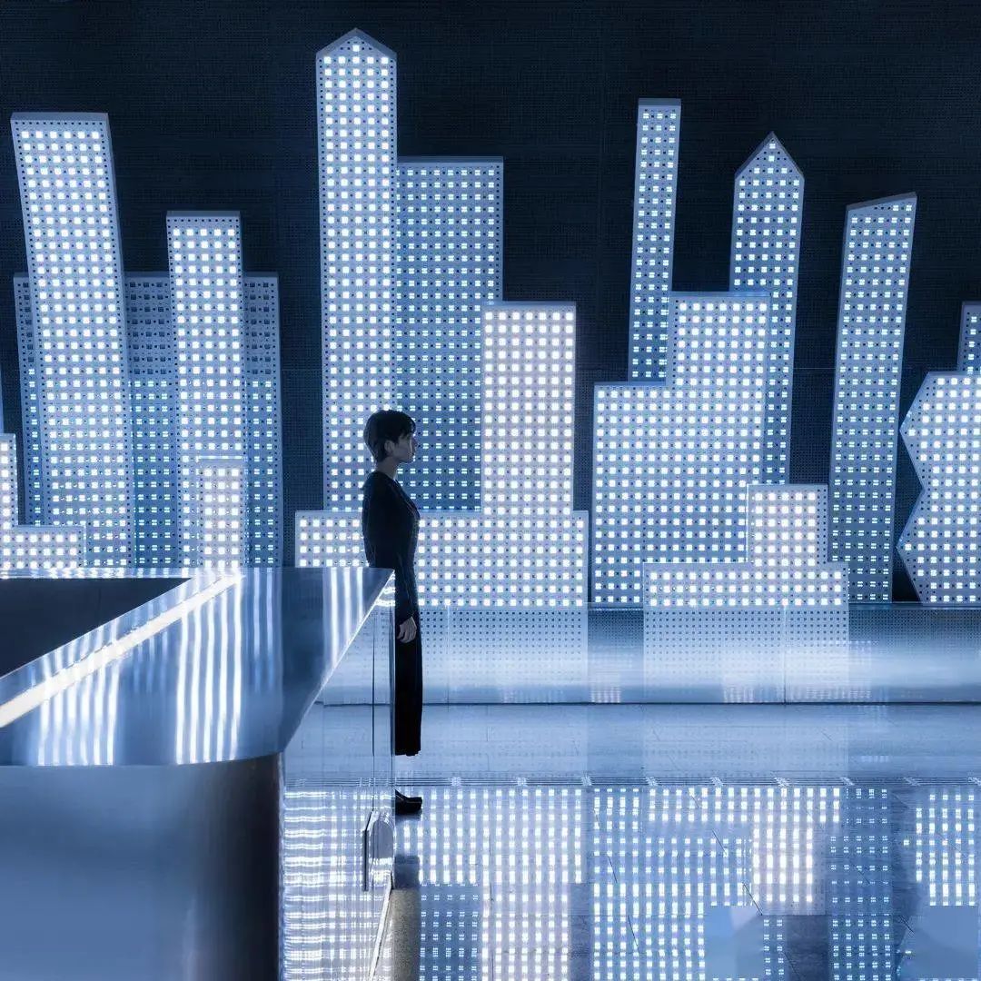 两边的弧形墙面上是黄浦江两岸的天际线灯板,蓝白灯光倒映在大理石地面上,科技大片既视感!
