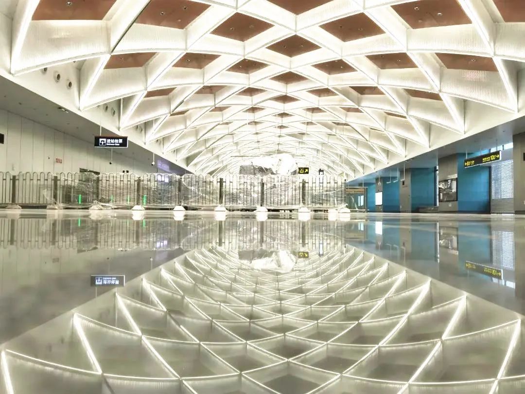 站内菱形天窗弧顶像一张巨大的网,无柱车站的大空间通透敞亮。