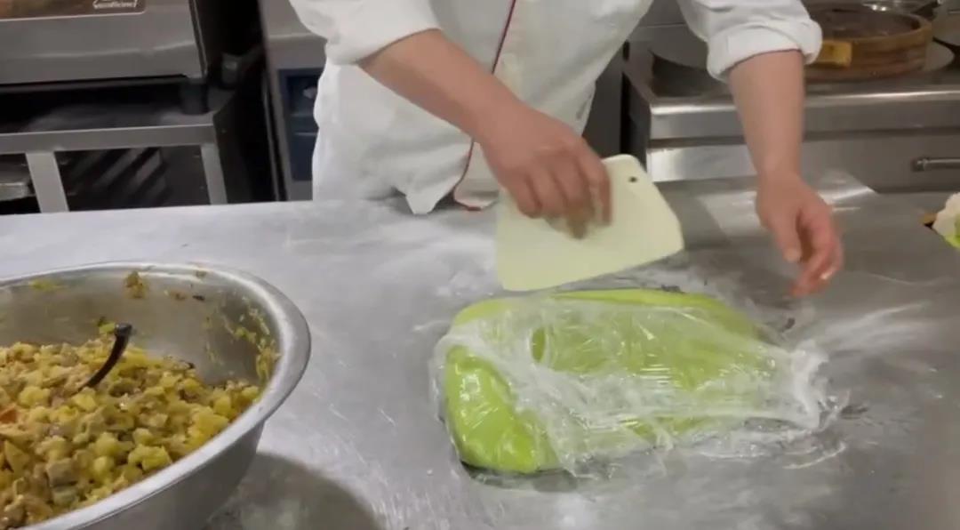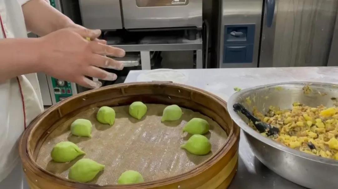 黄任康的解决方案是,在汤料上“下功夫”。他表示,“先熬制出鲜美的高汤汤头,凝固成冻,再与切成丁的高级食材一起包入青团胚子中,这样就可以锁住鲜味,一口下去吃到里面的汤。”