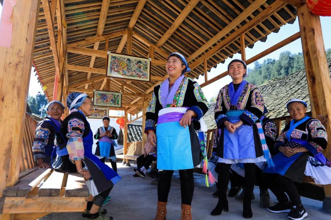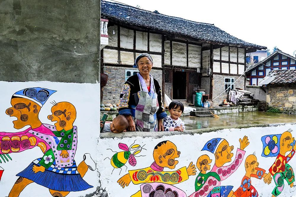 在农忙之余,妈妈们“画山画水画自己,画天画地画生活”,把苗族悠久的蜡染、刺绣等传统艺术从布上转移到了纸上,再从纸上画到了全村寨的墙面上,由此发展出平坡村独有的绘画风格和内容,被称作“平坡苗族绘画”,更被赞誉为“东方的毕加索”。