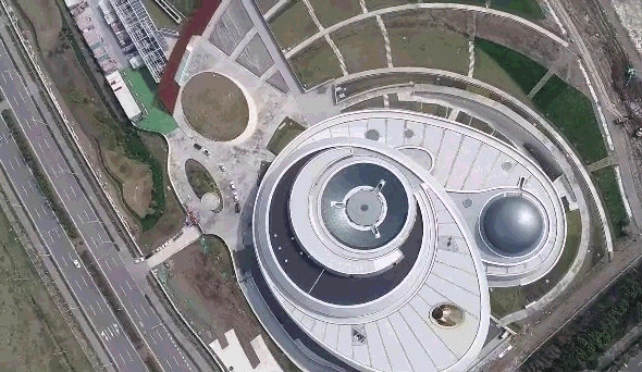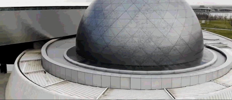 设计师先设置了3个圆形球体,之后假想一颗卫星的运动轨迹,在球体外运行,最终形成天文馆的建筑造型。