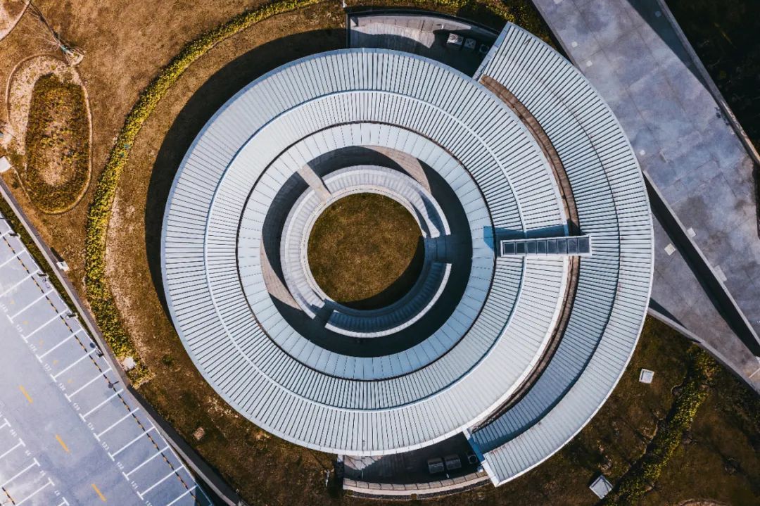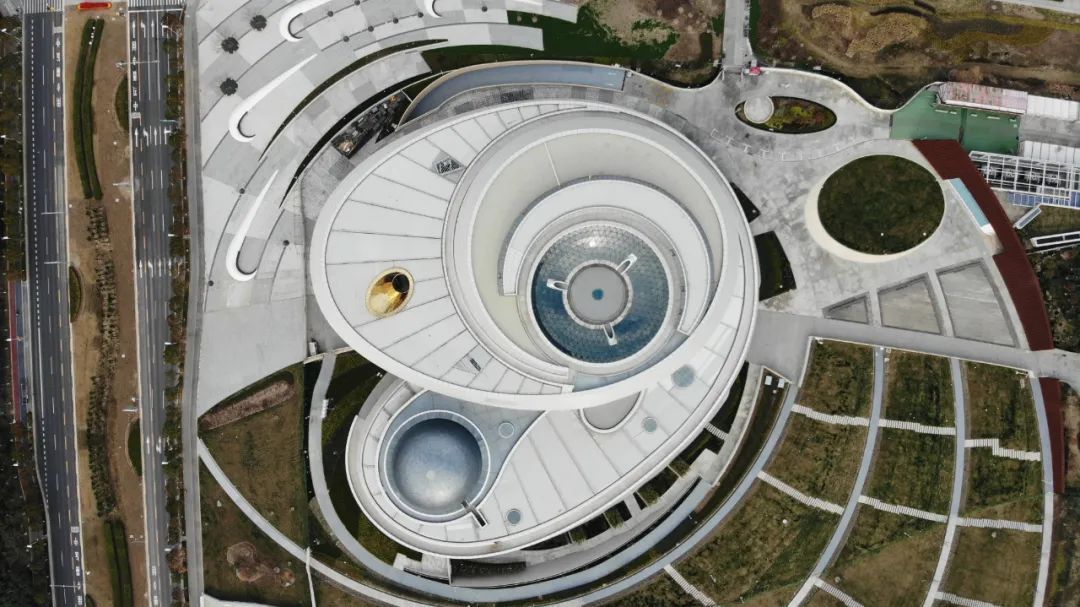 内径23米、外径约30米的球幕影院,从远处看去,就像一个天体漂浮在空中,阳光从镂空的圆环投射下来,会在地面上形成一个圆弧,随着时间推移而在地面移动。