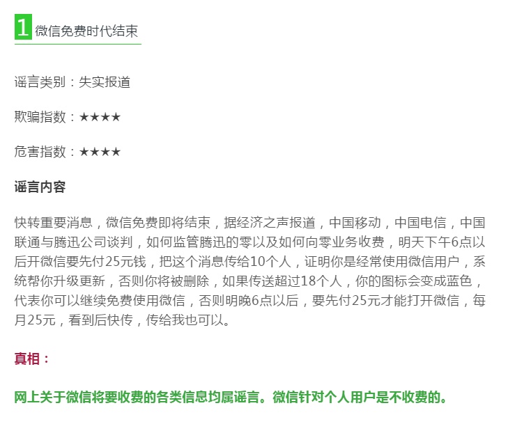 △2019年3月30日,“微信安全中心”曾辟谣:网上关于微信将要收费的各类信息均属谣言。