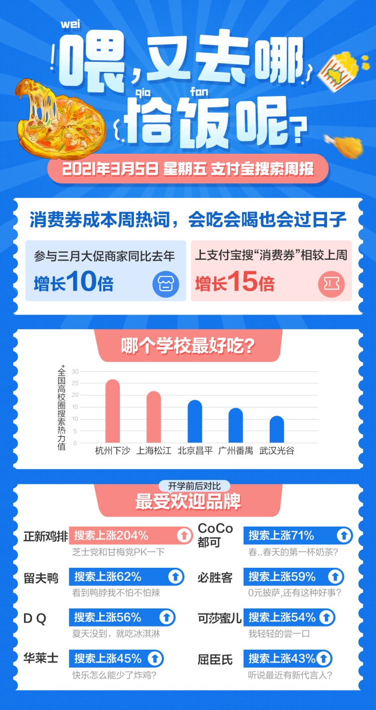 假期结束,各地消费逐步回暖,“消费券”成为最热词,同比搜索量增长15倍。本周为支付宝“三月开门红”大促上线的首周,用户可通过搜“消费券”进入活动主页,参与商家与去年同期相比增长10倍。