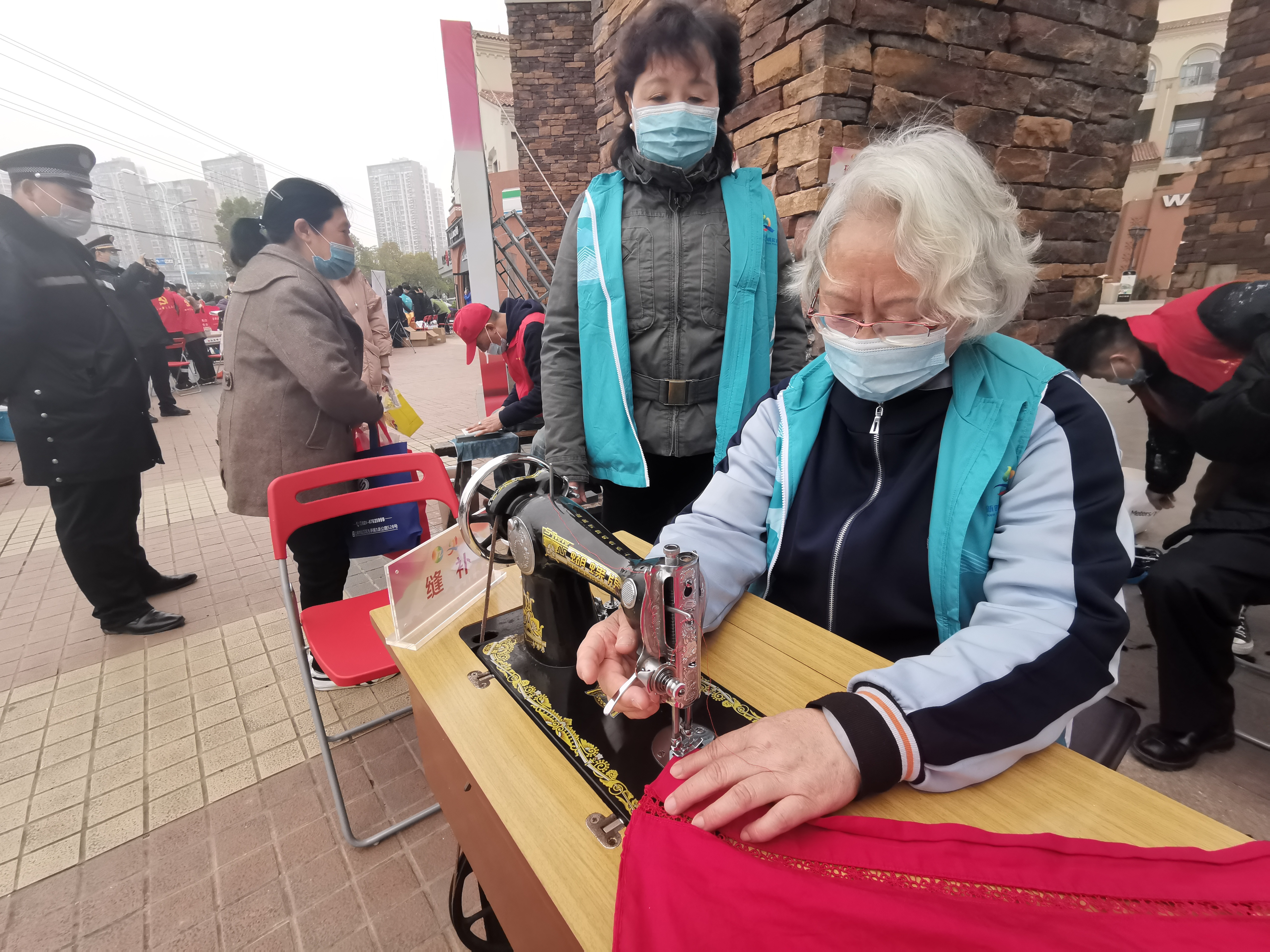 卢荣荣是贝尚湾的居民,也是一名志愿者,今天她在缝纫机摊位前帮周边居民缝缝补补。“我们退休在家没事情,出不了大力气,但力所能及的事情还是要干一下的。”卢阿姨嘴里说着,手里片刻不停下来。“这个红色的线跟你被罩颜色相配,你看用这个可以不啦?”