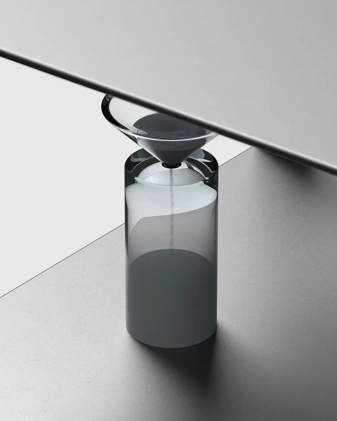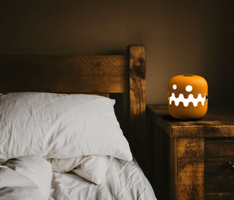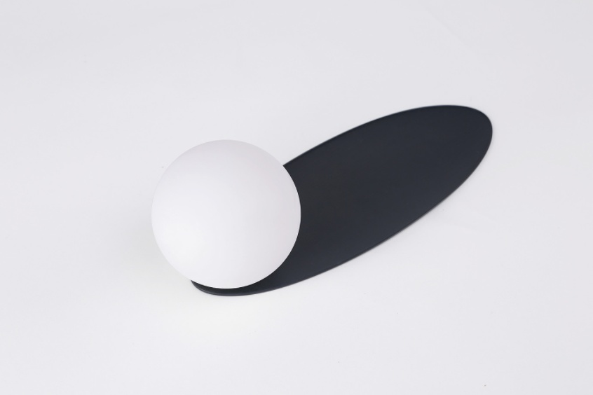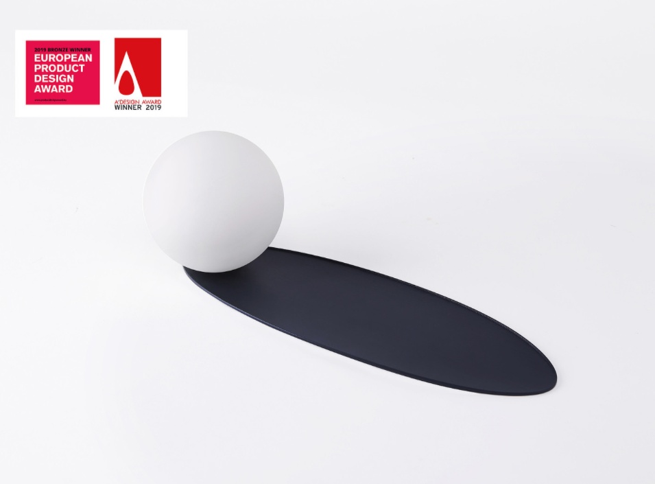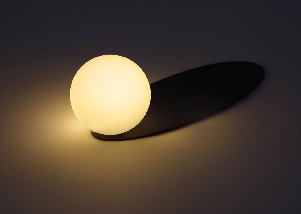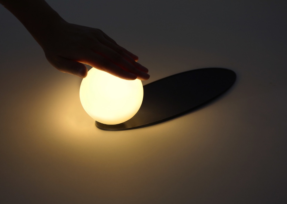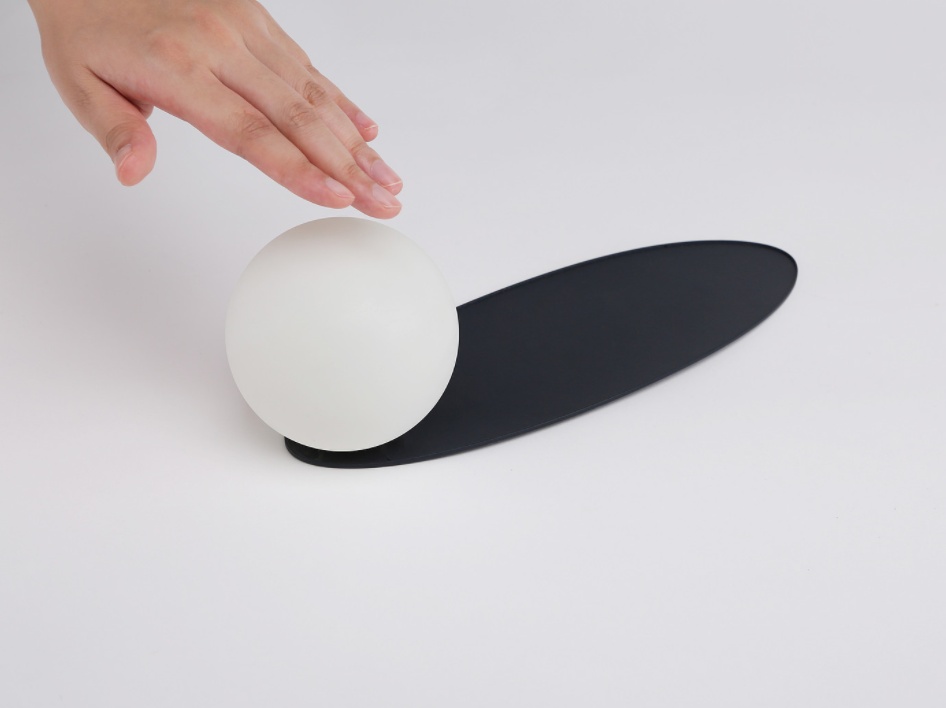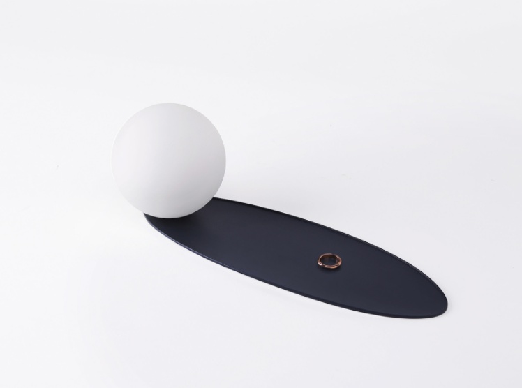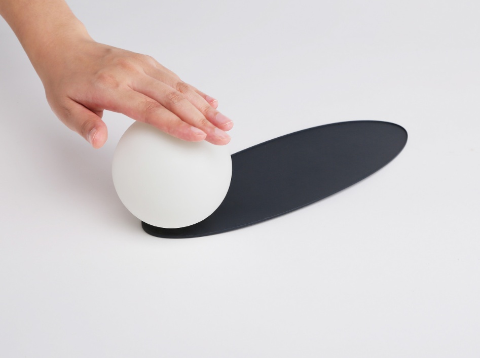 一盏球形夜灯,底部为一个椭圆托盘,可以随手放置一些小物件同时托盘的形状就像是球形夜灯斜斜的“影子”。影子这个符号让我们联系起将物品放置在隐蔽处的固有性行为,借助这种形态所形成的关联故而给置物在托盘上提供一种心理上的安全感,同时灯亮的情况下我们看到它的“影子”也能构成一种有趣的思索。