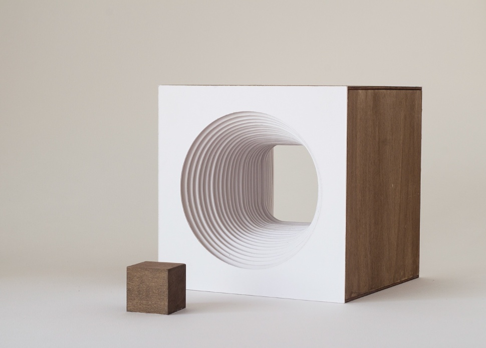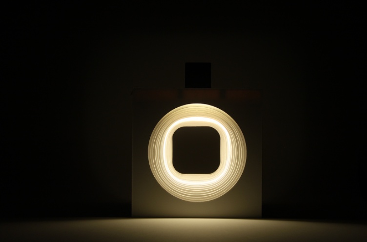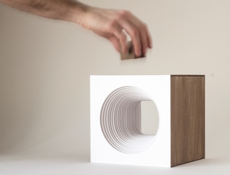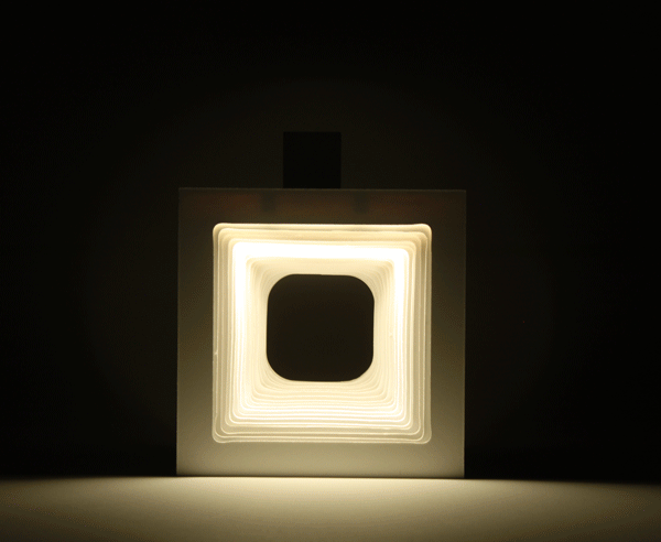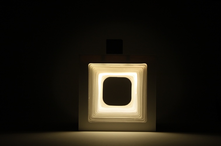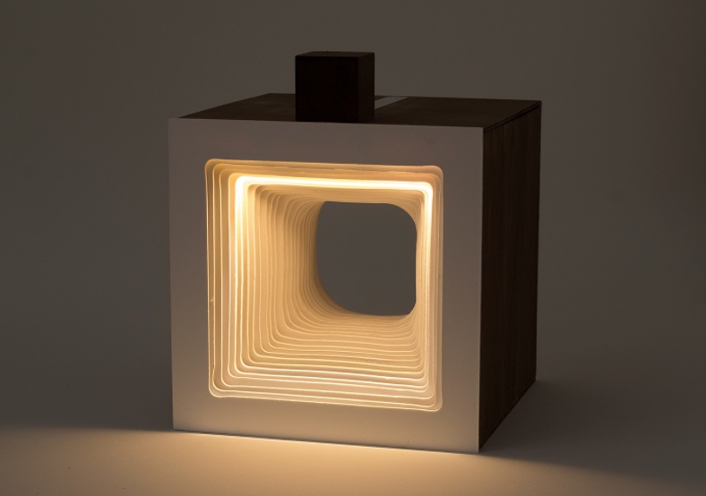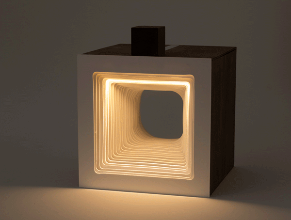 让光流动起来。灯的外壳是一个木质正方体框架,光源层层递进,内部安装有一个带磁极滑动轨道的灯管,还有一个带磁性的小方块,将方块放置上部轨道前后滑动,光源也会随之滑动。