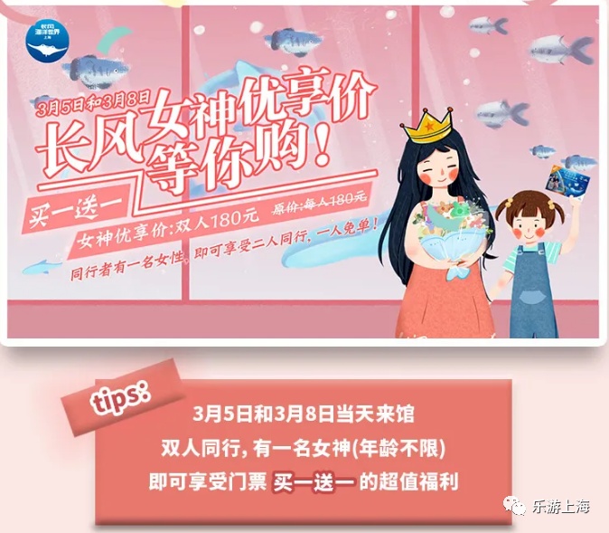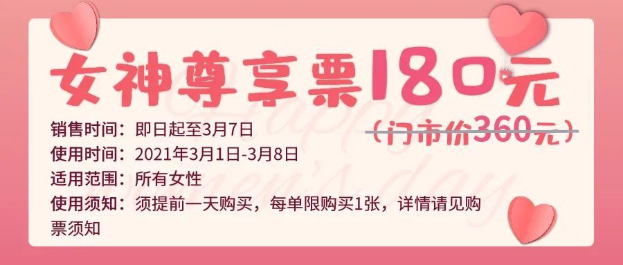 即日起至3月7日,女性游客可享受180元的女神尊享票。使用时间为3月1日至3月8日,须提前一天购买,每单限购1张。